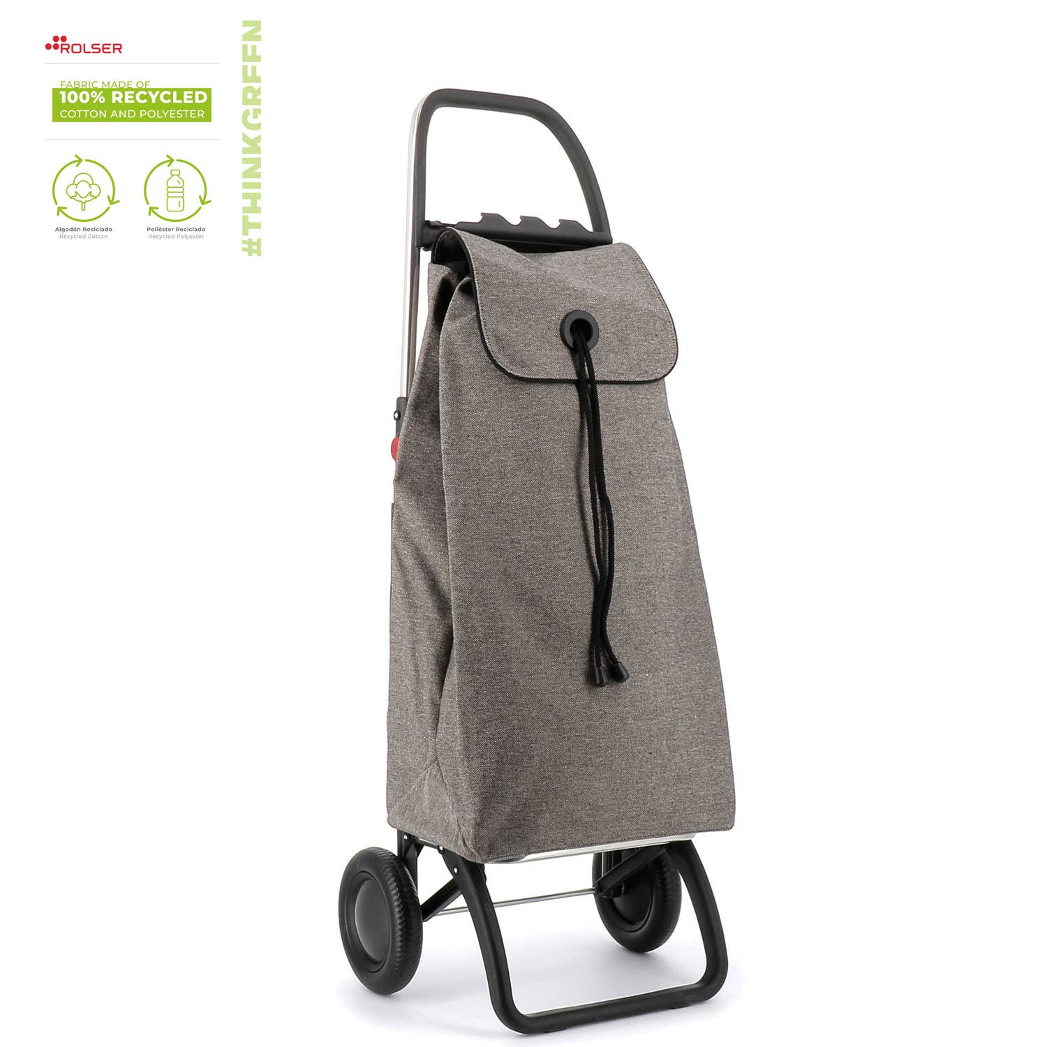 ECO KOLLEKTION! Rolser indkøbsvogn i foldbart aluminium med 2/4 hjul. I tohjulsposition til at trække, når den er tom, og i firehjulsposition til at skubbe, når den er fuld. Er en af Rolsers mange teknologiske fremskridt. Designet inkorporerer vores roterende hjulsystem, der giver dig mulighed for at styre vognen på en mere bekvem og præcis måde. 4LT-chassiset har et system fremad til fuldstændig foldning. Multifunktionel krog, der kan tilpasses til supermarkedsvogne og til at hænge tasker og/eller andre produkter. Afhængigt af den valgte funktion, skift manuelt krogens placering fra det øverste håndtag til midterrammen. Det vil hjælpe dig med enhver form for overførsel af små laster. Perfekt til at bære genstande til vaskeriet, til stranden, indkøb, til fitnesscentret osv. Stoffet, der anvendes til ECOIMAX, kommer fra genanvendt bomuld kombineret med polyesterfibre fra PET-flasker. Den perfekte kombination for at opnå en komponent, der er 100% miljøvenlig. ECOIMAX-tasken kommer i rygsækformat, med dobbelt indvendig lomme, snorelukning, øje på klappen, lynlåslomme bagpå og tilpasser sig let til chassiset med en klap. Stofindhold - Polyester