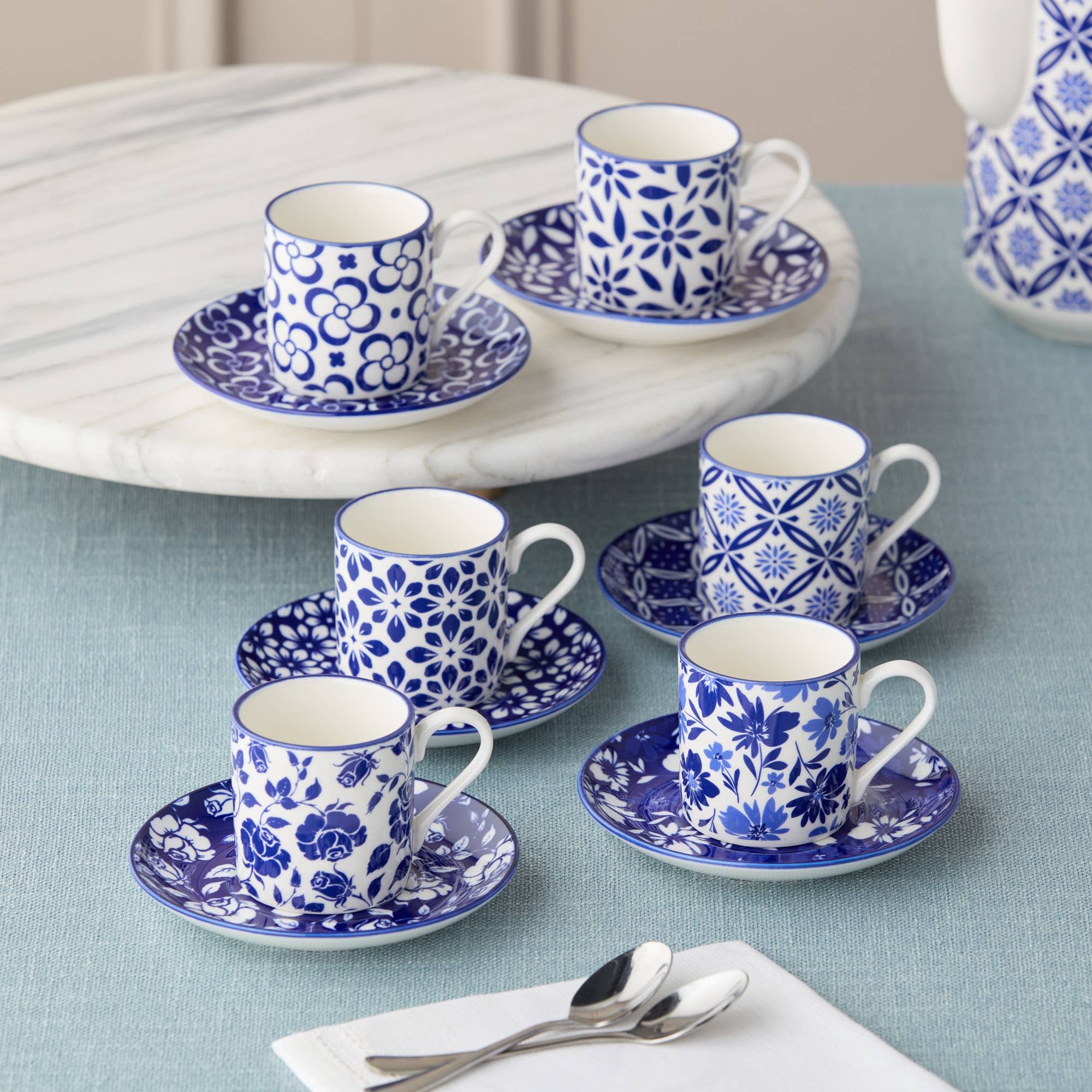Forbedr din kaffeoplevelse med Madison-sættet bestående af 6 espresso kopper og underkopper, som kombinerer funktionalitet og elegance. Hver kop på 3,25 oz (96 ml) og underkop på 4,75 tommer (12 cm) er lavet af førsteklasses porcelæn, der sikrer holdbarhed og en glat finish, som fremhæver dine espressoøjeblikke. De detaljerede blå og hvide mønstre tilfører din kaffe en tidløs charme, hvilket gør dette sæt til et stilfuldt supplement til dit køkken eller spisebord. Kopperne er perfekt dimensionerede til espresso og tilbyder den rette kapacitet til at nyde din yndlingsbryg, mens underkopperne giver en praktisk og elegant base til at opsamle dryp eller holde en ske. Sættet er designet til moderne bekvemmelighed og tåler opvaskemaskine, hvilket sikrer nem rengøring efter brug. Uanset om det matches med andre dele fra Madison-kollektionen for et samlet udtryk, eller gives som gave til kaffeelskere ved housewarming, bryllup eller højtider, kombinerer Madison espresso kop og underkop sæt stil og funktionalitet. Gør hvert kaffestund speciel med dette tidløse sæt.