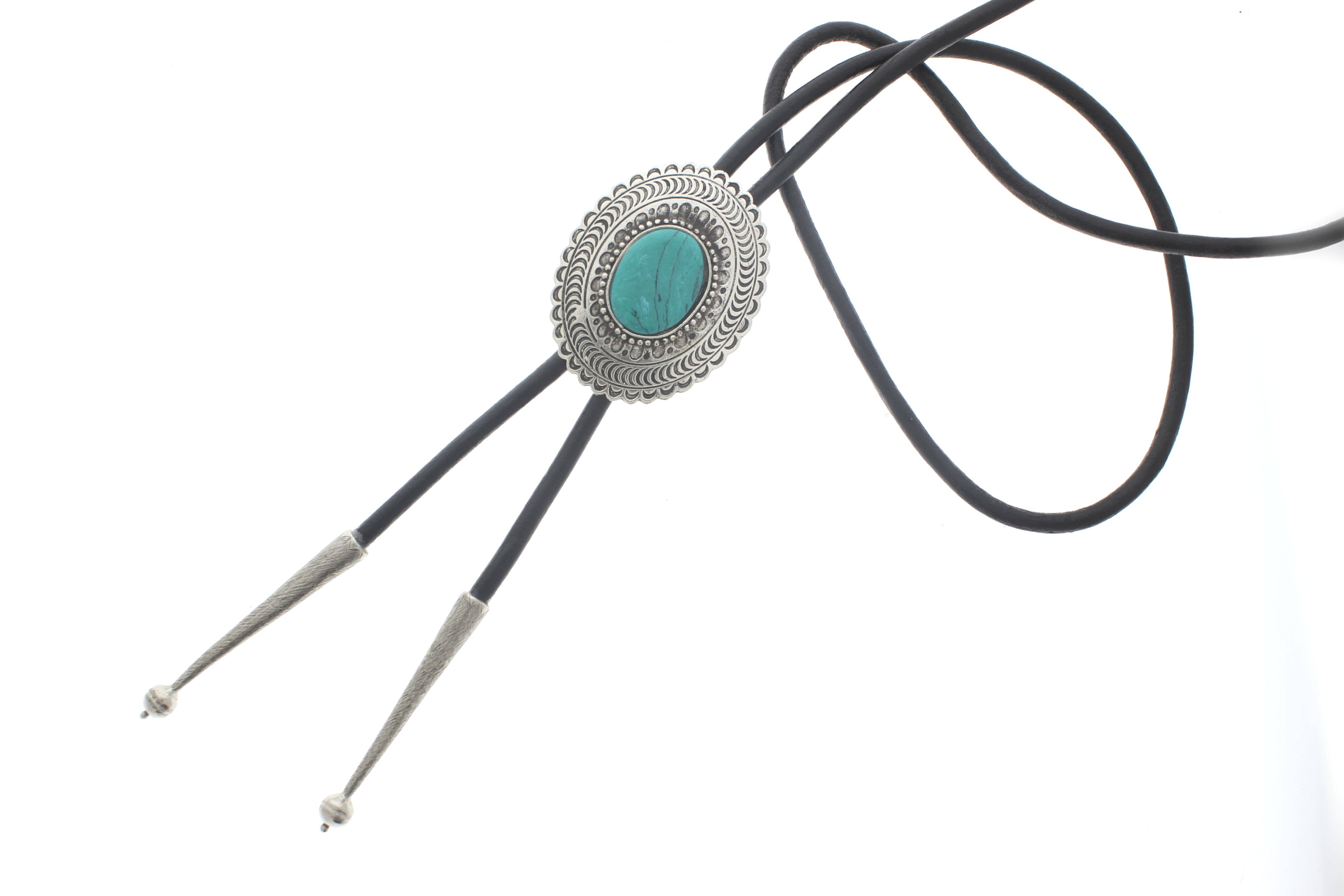 Lav et markant indtryk med denne flotte bolo slips, der har en smuk oval turkissten indfattet i en detaljeret sølvfarvet concho. Den geometriske ætseteknik og perledetaljer tilfører en charmende sydvestlig stil, mens det justerbare design sikrer en perfekt pasform. Kombiner med en sort eller brun lædersnor for et alsidigt og stilfuldt tilbehør, der passer til ethvert outfit. Mål: 56,4 mm x 43,7 mm