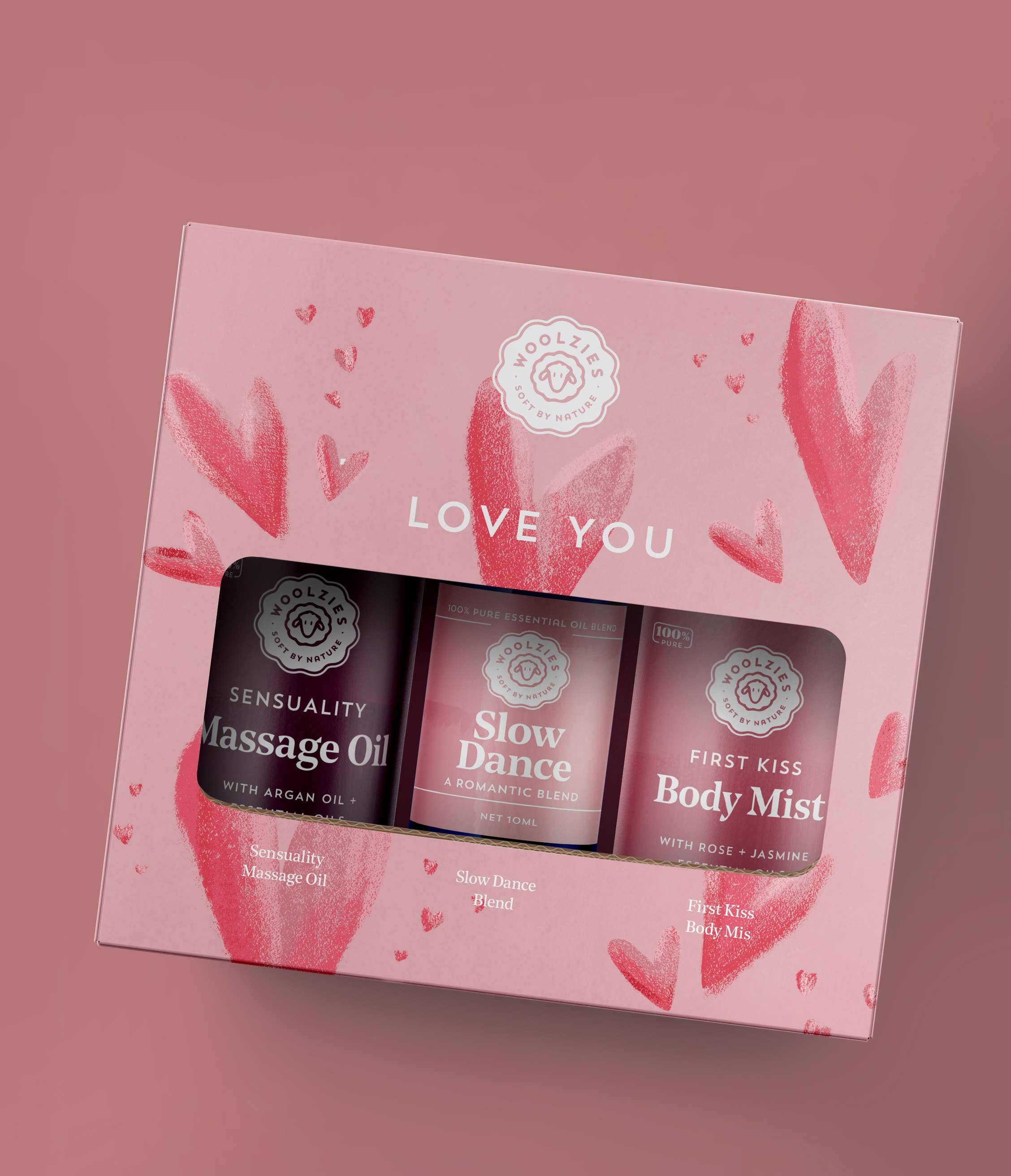 SENSUALITET MASSAGEOLIE Formuleret med æteriske olier og en blanding af nærende carrier olier til dybt fugter huden. Ingredienser arganolie, fraktioneret kokosolie, macadamia nøddeolie, jojobaolie, mandelolie, ricinusolie, geranium, neroli, lavendel og rose æteriske olier. SLOW DANCE OIL BLEND Vil du injicere romantik ind i rummet til en særlig aften? Slow Dance Essential Oil Blend er formuleret med sensuelle olier, der vil gøre netop det. Ingredienser: Jasmin, Geranium, Rose, Sandeltræ, og citron æteriske olier. FIRST KISS BODY MIST Afslut ethvert romantisk look ved at spritzing på en smuk buket dufte. Ingredienser: Rose, geranium, merian, kalk, palmarosa, sandeltræ og cedertræ æteriske olier, hydrogeneret ricinusolie, aloe vera ekstrakt, agurkekstrakter, troldnød ekstrakter, lavendel, kamille, appelsin, & jasmin æteriske olier, radise rod ekstrakter og kaliumsorbat.