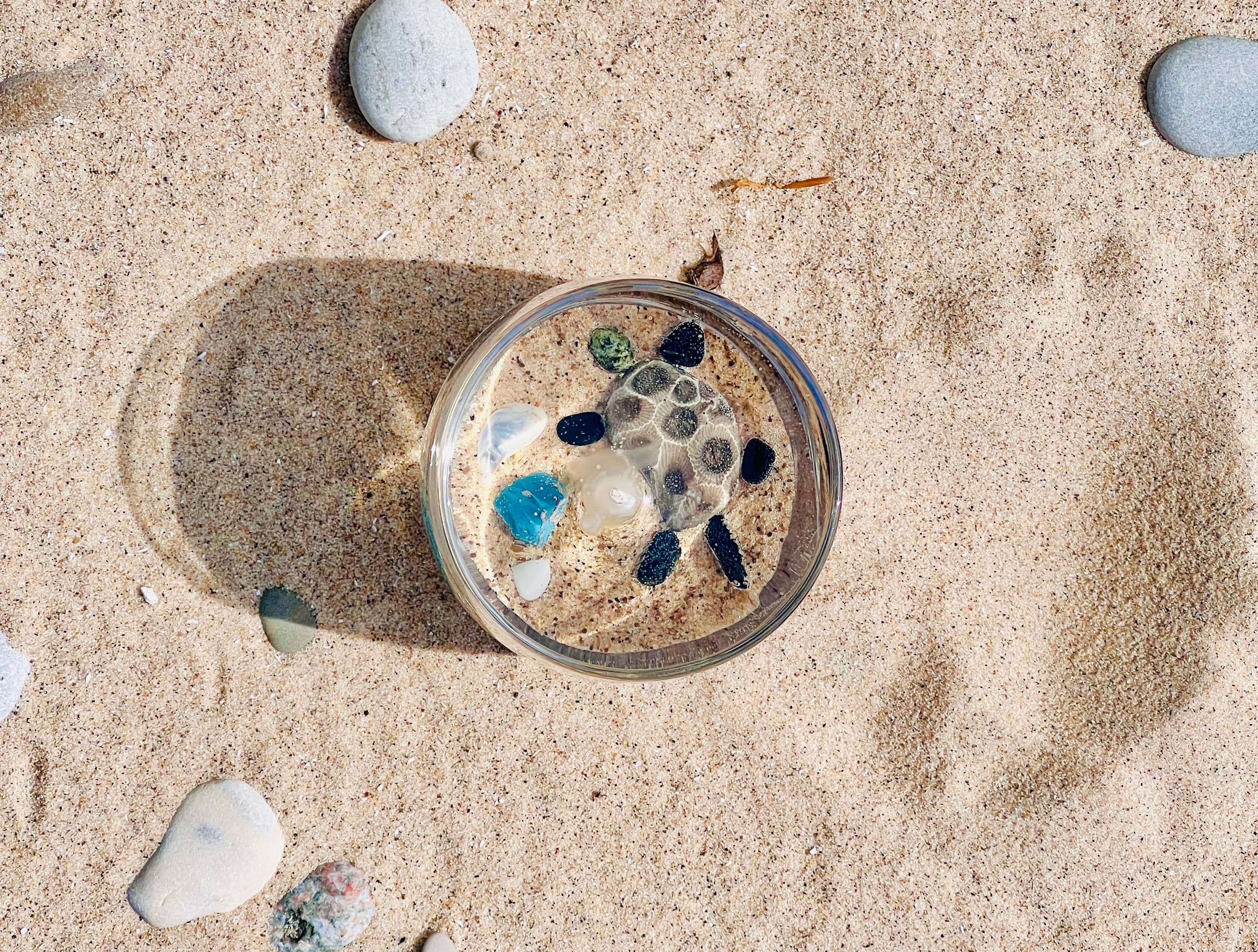 Store Søer indsamlede sten fra Leelanau County, Michigan. Hver lys har en Petoskey-sten, mange har Leland-blå og andre farver fra De Store Søer. Kurateret og håndstøbt i Suttons Bay, Michigan. Lys fremstillet af gelvoks, blandet med mineralolie og æteriske olier.