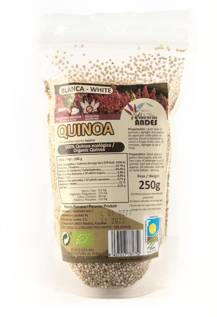 Quinoa, en indfødt mad fra Andesbjergene, hvis plante dyrkes organisk og organisk mere end 3.800 meter over havets overflade, har en høj proteinværdi (rig på aminosyrer), er meget nærende og energisk. Den er rig på mineraler som jern, magnesium, fosfor, kalium og calcium; såvel som i B-vitaminer, C-vitamin, E, thiamin og rivoflavin. Det indeholder også 18 aminosyrer, inklusive alle de essentielle aminosyrer, det vil sige byggestenene, hvorfra proteiner er bygget. Det er perfekt egnet til vegetarer, cøliaki og mennesker, der er intolerante over for gluten, fordi det ikke indeholder gluten og dets høje proteinindtag.