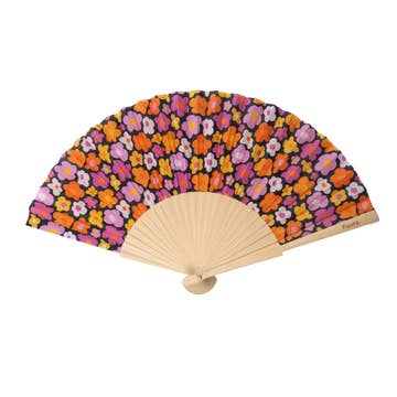 Vifte i limba-træ med 100 % bomuldstekstil med tryk. Viften har en pompom-detalje med kæde for et dekorativt touch. Størrelse: 23 x 42 cm.