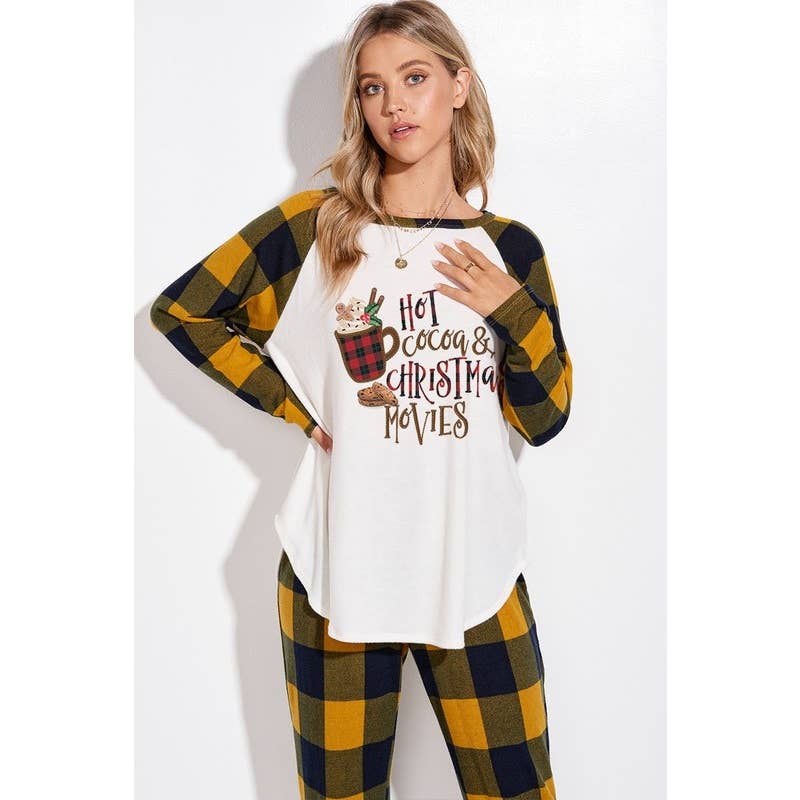 -Blødt loungetøjssæt med ferie-champagneflasketryk -Matchende sæt -Top og bund sæt -Sleep-lounge tøj -Blødt stof, afslappet stil, hverdagsbrug. -Model størrelse: Lille (5'10" 31- 23- 34) -Fremstillet i USA