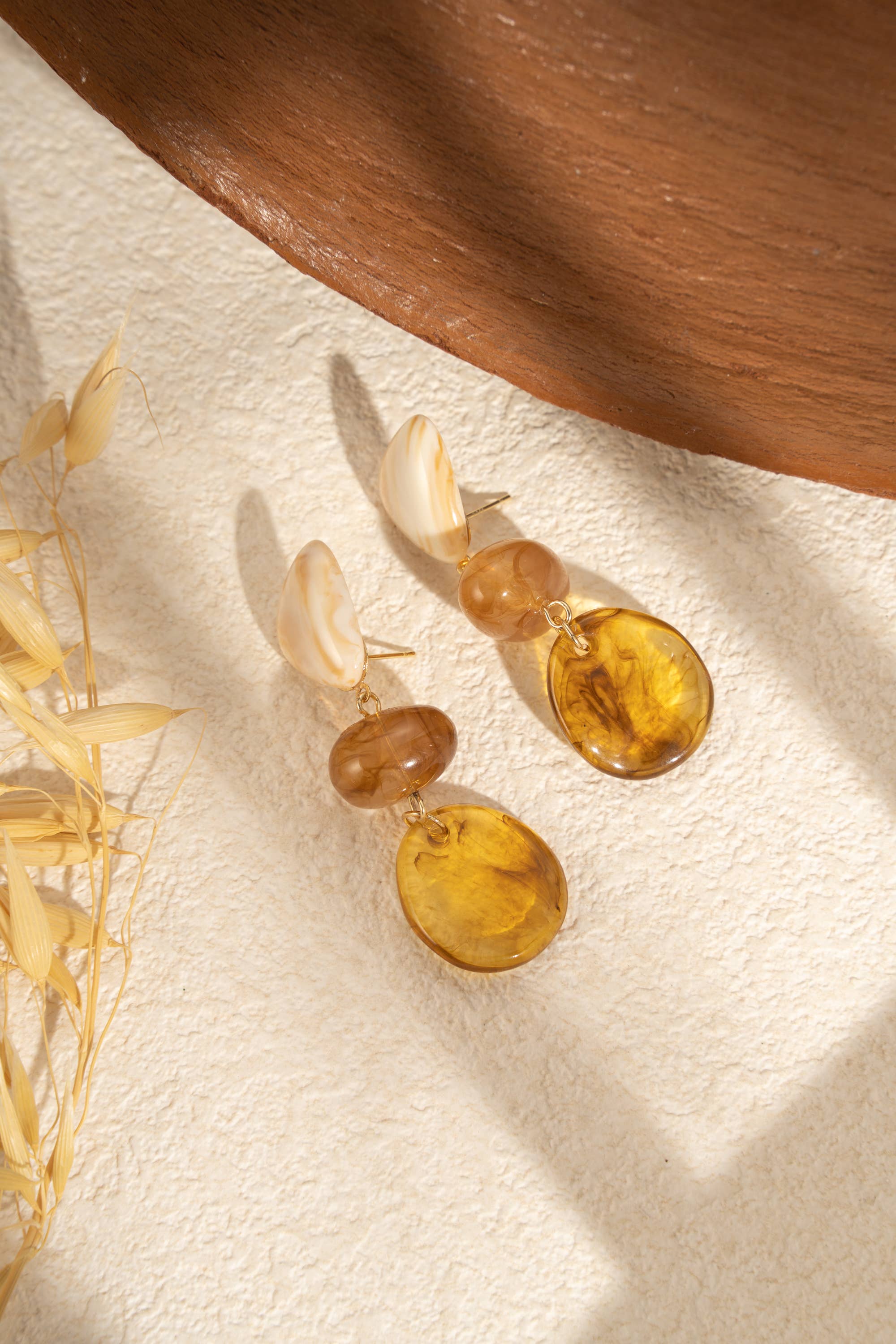 Kvinde øreringe i hængende design med ovale resin i gradient, nuancer af brun, creme, bordeaux. Elegant og farverigt design, skinnende finish, stang i forgyldt rustfrit stål. Chic, let og allergivenligt mode smykke. Perfekt til boheme, efterårs- eller kunstnerisk look. Trendy modeaccessorie i rustfrit stål, uden nikkel, uden cadmium og uden blysalte.
