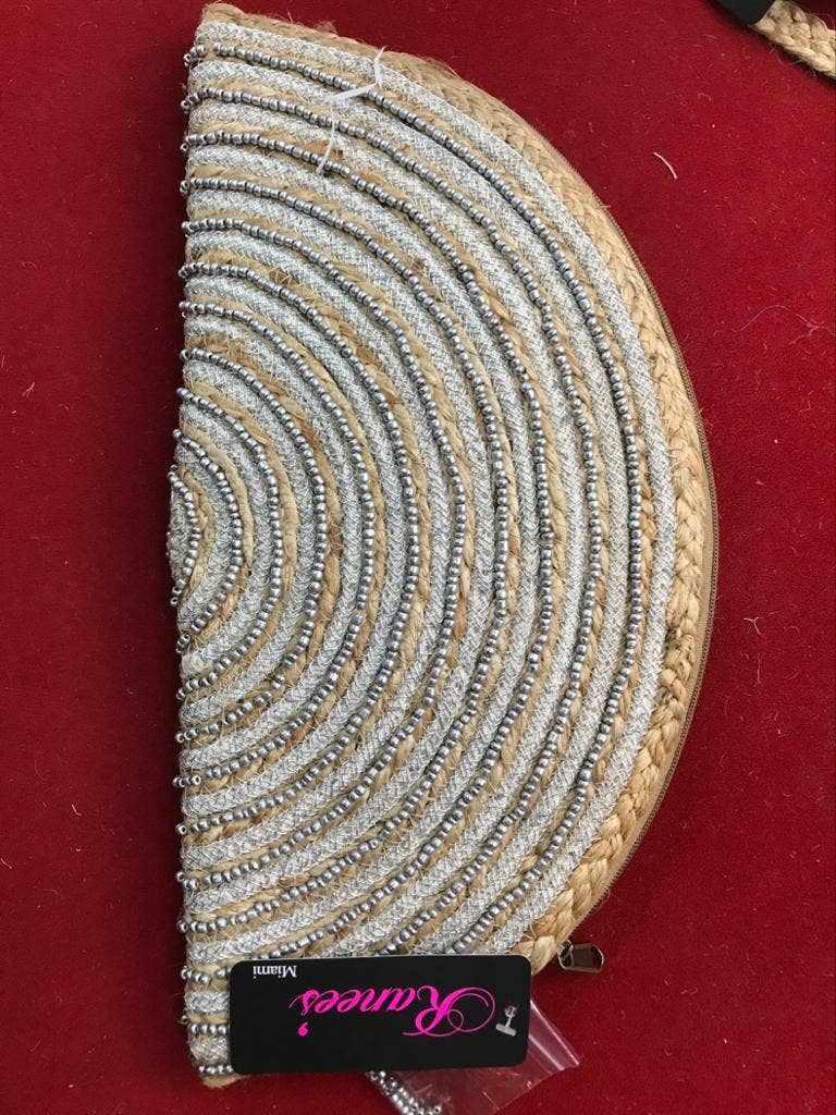 Fra Ranees tilbehør bringer vi dig vores broderede clutch. Denne håndlavede silkeklutch kan prale af udsøgt guldbroderi, et vidnesbyrd om vores kunsthåndværkers omhyggelige håndværk i Indien. Med inspiration fra forskellige elementer på jorden stræber vi efter bæredygtige metoder til at skabe vores tilbehør. Vi håber, at dette stykke bringer lige så meget glæde for dig, som det gør for os ved at lave og tilbyde det. Designet af Kiran Khiyani er denne clutch ikke kun et tilbehør, det er en skat fra Indien til verden!