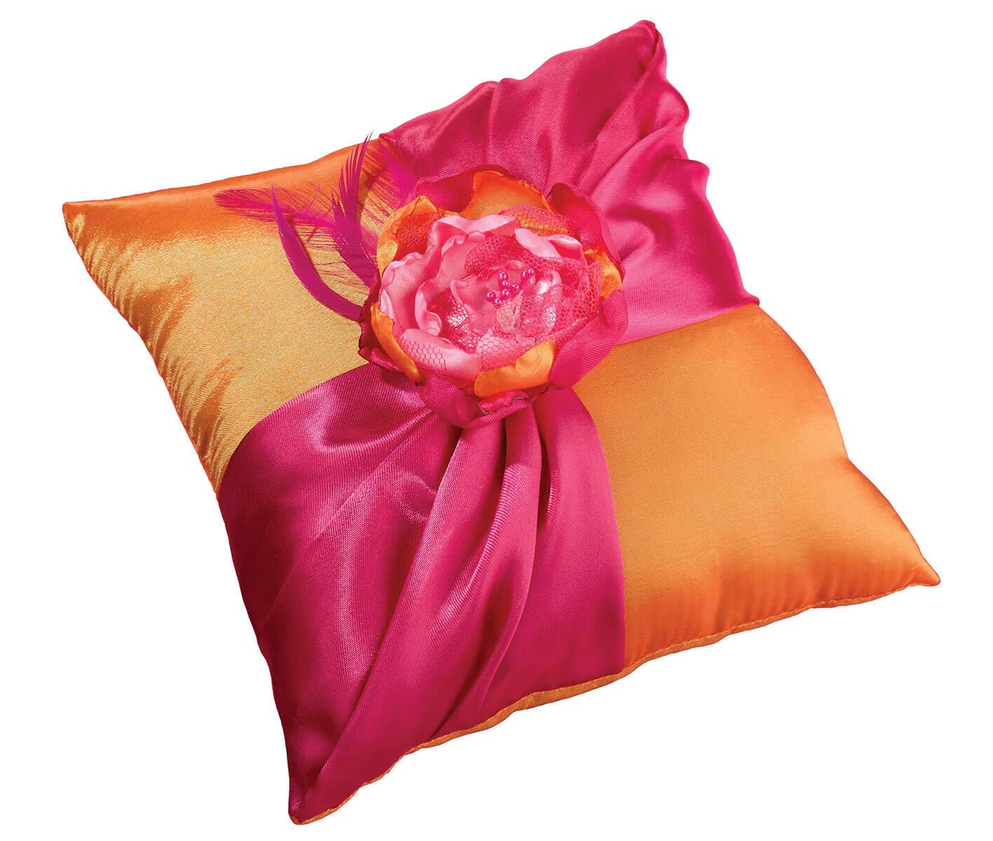 Denne stilfulde 7 „satin ring bærer pude er smukt skabt med levende blues og greens. Forsiden er dekoreret med fjer og to farvematchede blomster med rhinestone centre.