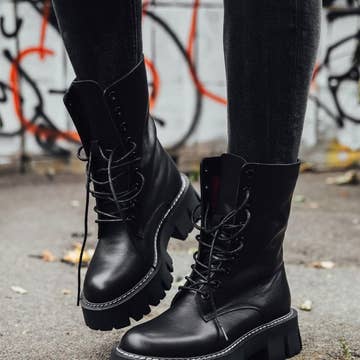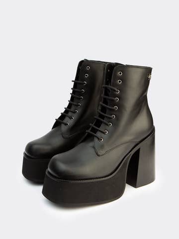 Vis din karakter med disse sorte dameboots inspireret af den militære stil, genfortolket i streetwear. Udstyret med en skinnende finish og tykke, rillede såler, kombinerer de æstetik og funktionalitet. Deres snøring, forstærket med mange metaløjer, sikrer fremragende støtte og et dristigt look. Perfekte til at pifte et enkelt outfit op eller fuldende et selvsikkert urbant look. Egenskaber: • Stil: Rock / Urban / Street • Tå: Rund • Skaft: Mellemhøjt med fuld snøring • Lukning: Snørebånd + lynlås i siden (valgfri afhængigt af model) • Detaljer: Metaløjer, tyk rillede såler, skinnende finish • Ydermateriale: PU med laklæderlook • Foring: Blød og åndbar • Indersål: Polstret for optimal komfort • Ydersål: Skridsikker platform med riller
