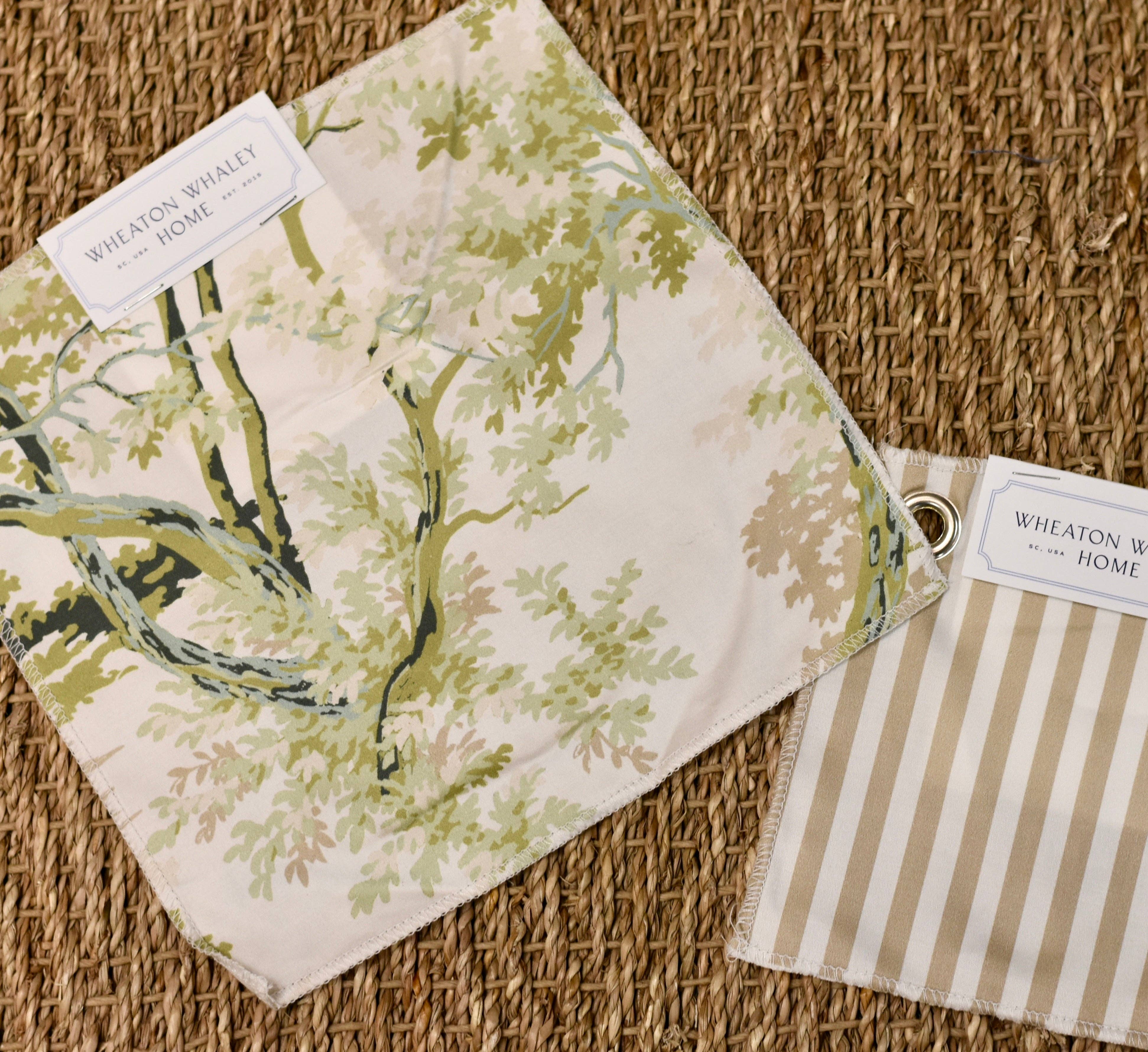 Vi anbefaler altid at se stoffer og farver personligt, før du bestiller brugerdefinerede varer. Billeder ser ofte anderledes ud online, end de gør i det virkelige liv. Desuden kan belysningen i et rum, og endda andre farver i rummet, ændre udseendet af et stof. Samlingsprøvesættene inkluderer de to vigtigste sengetøjsstoffer og draperiprøver, som vi anbefaler med sengetøjet. Vi har bestilt stof og trim lavet prøvesæt fra samlingerne til at sende til dig! Vi sætter pris på muligheden for at skabe noget specielt til dit rum.