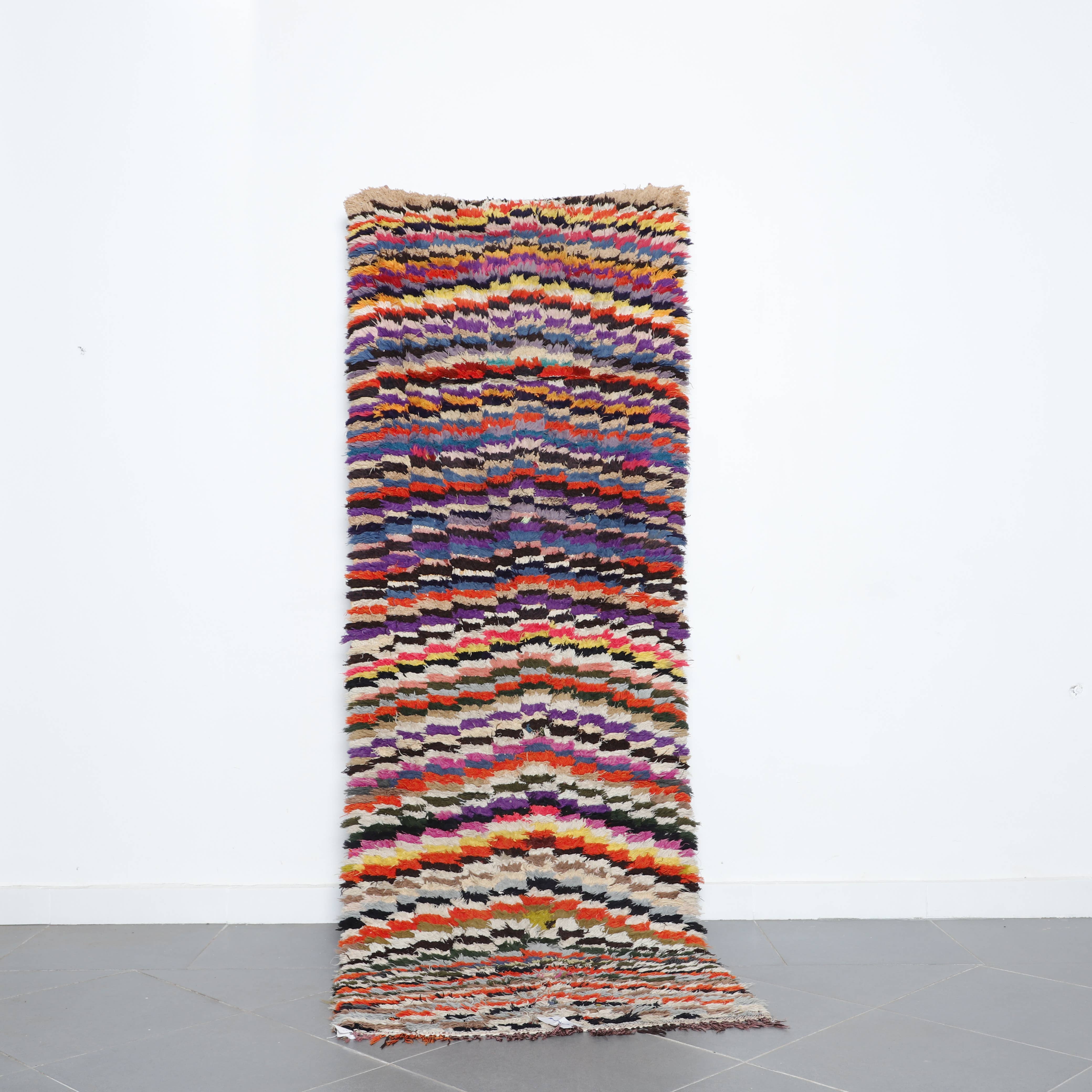 Forvandl dit rum med dette livlige farverige tæppe, håndvævet af dygtige marokkanske håndværkere. Med et abstrakt design med en række lyse farver tilføjer dette tæppe varme, tekstur og kunstnerisk flair til ethvert rum. Dette marokkanske farverige tæppe er perfekt til moderne eller traditionelle interiører og er lavet af uld af høj kvalitet, hvilket sikrer holdbarhed og komfort. Nøglefunktioner: -Håndvævet med premium, blød uld. -Slank sort farve for et minimalistisk og elegant look. -Komplementerer både moderne og traditionelle interiører. -Holdbar konstruktion til langvarig brug. -Fås i flere størrelser, der passer til dit rum. Omdefiner dit hjems atmosfære med den tidløse elegance af det marokkanske sorte uldtæppe.