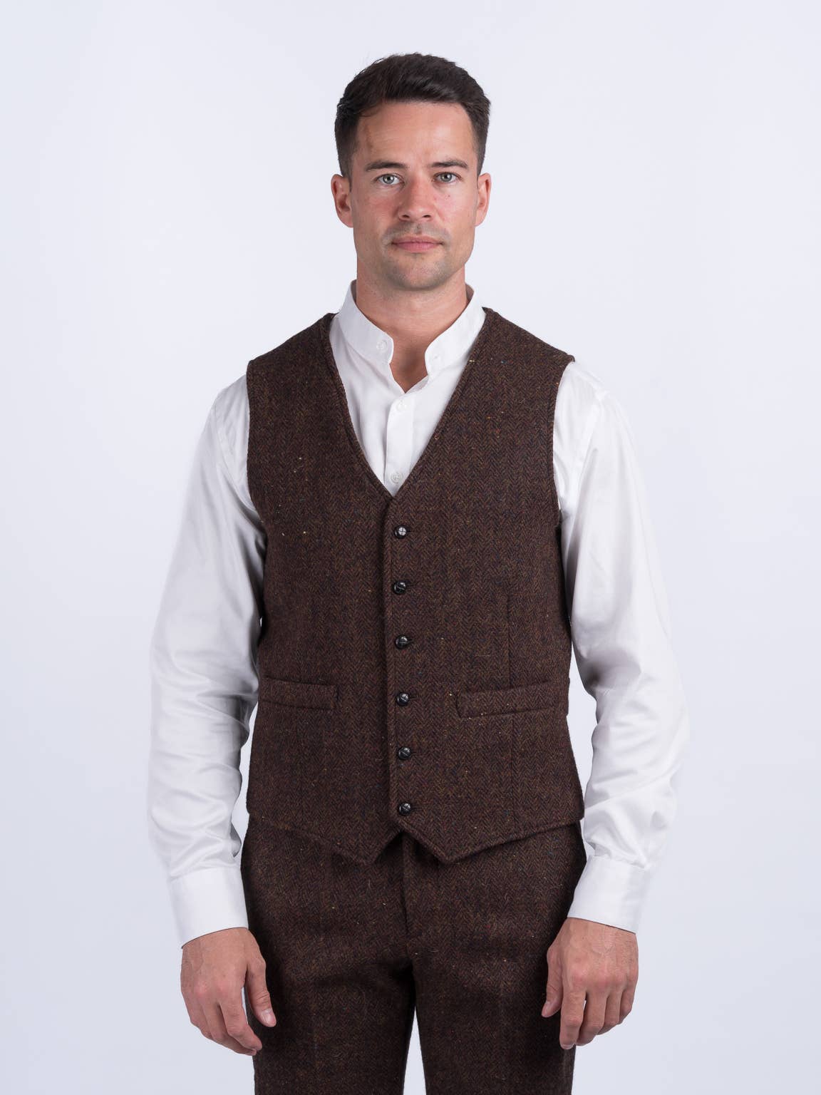 Detaljer: * Ternet kjole vest * Brun og grå * 5 knap lukning * Originalt design * Afslappet og formel * Letvægtsstof * Matchende design blazer og bukser sælges separat Stof og pleje: * 97% Bomuld, 3% Spandex * Tørrens Pakningsoplysninger: * En pakke: S/1 - M/2 - L/2 - XL/1 * B-pakke: M/1 - L/2 - XL/2 - 2XL/1