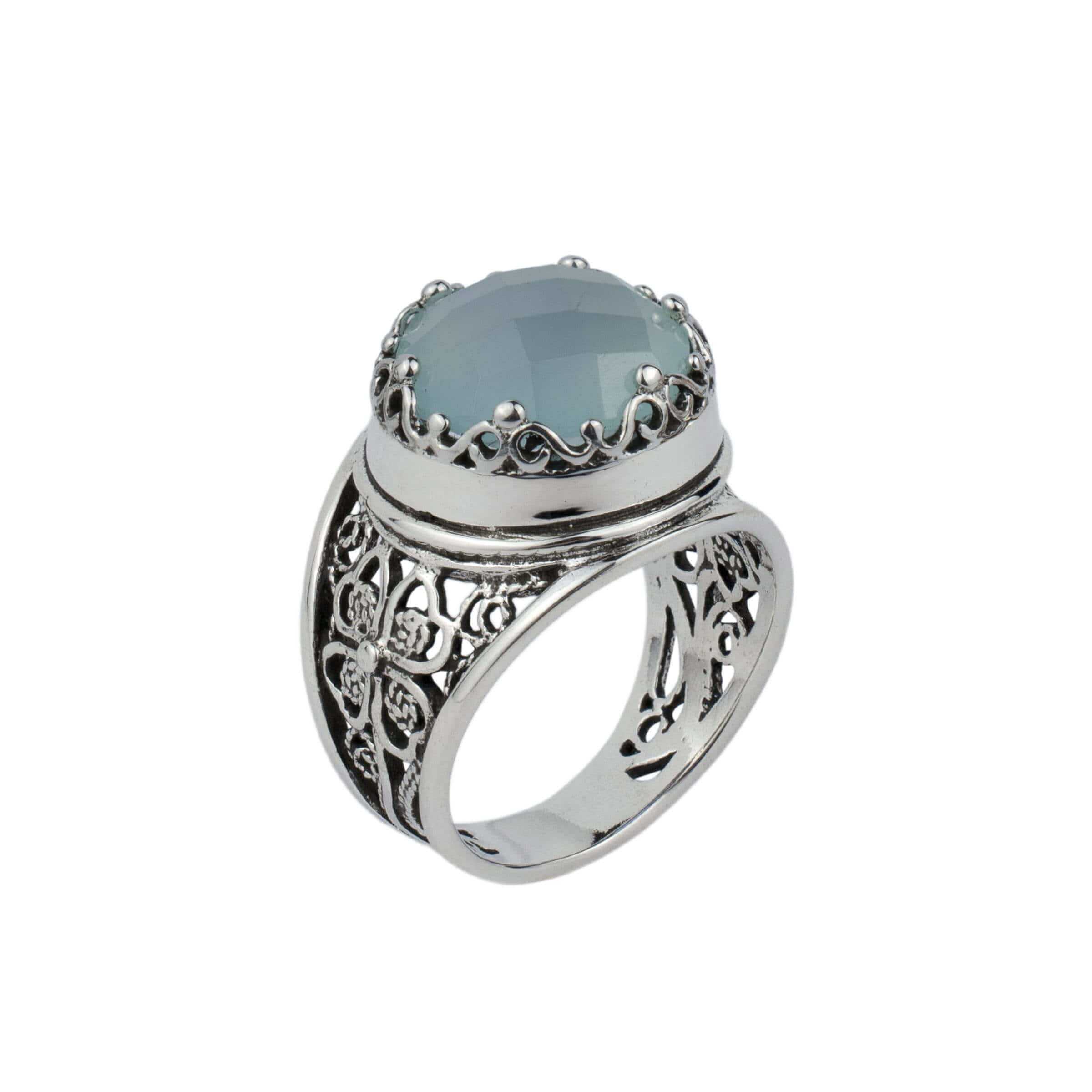 Sterling sølv filigran kunst kobber turkis ædelsten kvinde modig ring Ringens ansigtslængde er 0,75 tommer og bredden er 0,75 tommer Kobber turkis ædelsten er 12 mm og cabochon, rundskåret. Denne metalbroderi filigranring er oxideret og højpoleret. Filigran er lavet af delikate metaltråde, der er blevet dygtigt formet til at skabe en enestående kombination af gammel og moderne kunst. Oprindeligt fra Mesopotamien, Anatolien. Det er lavet af delikate metaltråde, der er blevet dygtigt formet til at skabe en enestående kombination af gammel og moderne kunst.