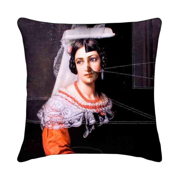 Denne farverige pude har en dame med udsøgt hår og en vidunderlig fløjlkjole - og et par tegneseriestilfunktioner har forvandlet hendes udtryk. Handler hun ærbar eller husker en pinlig faux-pas? Eller lytte til en dårlig stand-up komiker? Bestem dig selv, som du betragter denne dame sidder på din sofa derhjemme. Bemærk, da disse er nye designs leveringstiden er ca. 2-3 uger