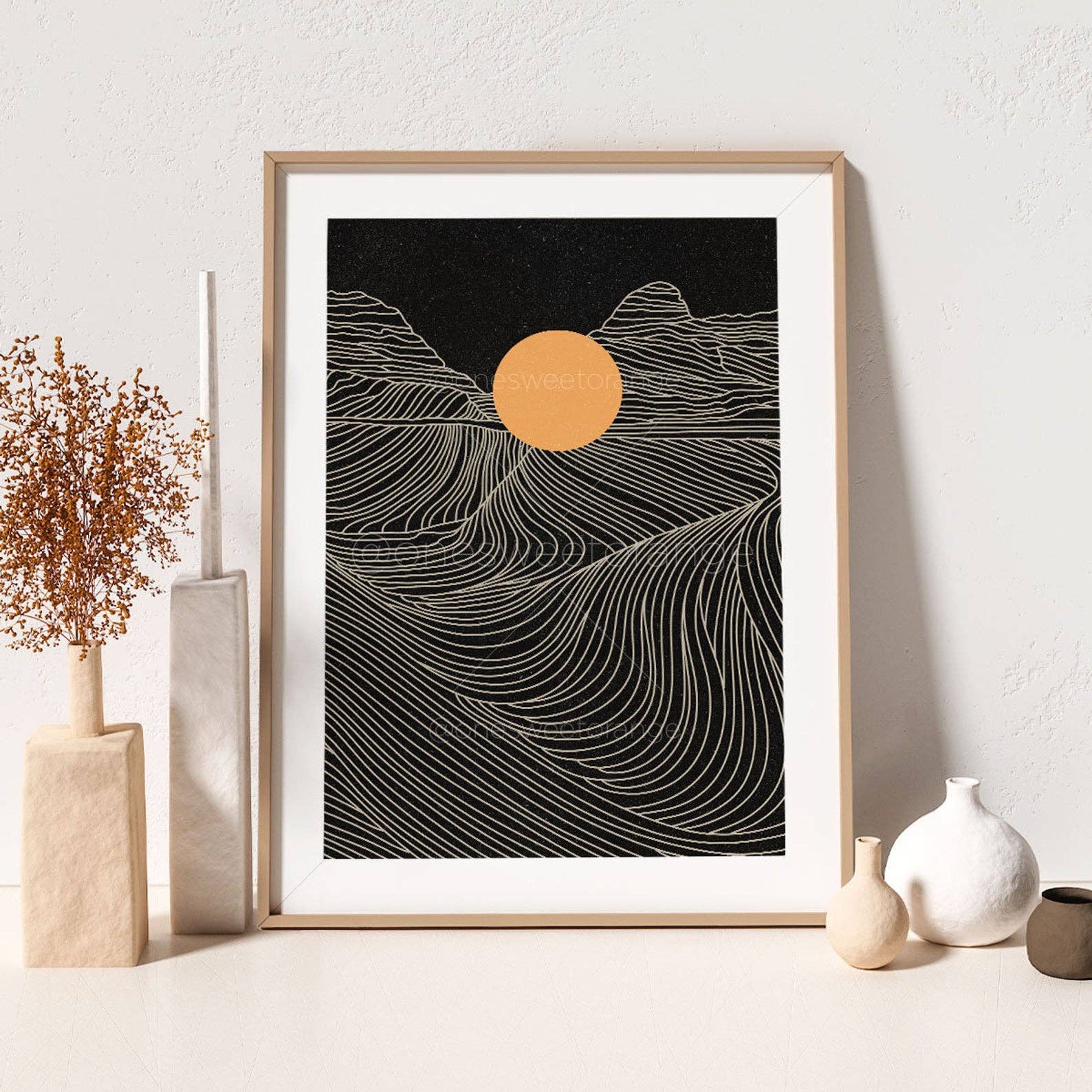 Bjerg Sol Linje Kunst Print Bjerg Print