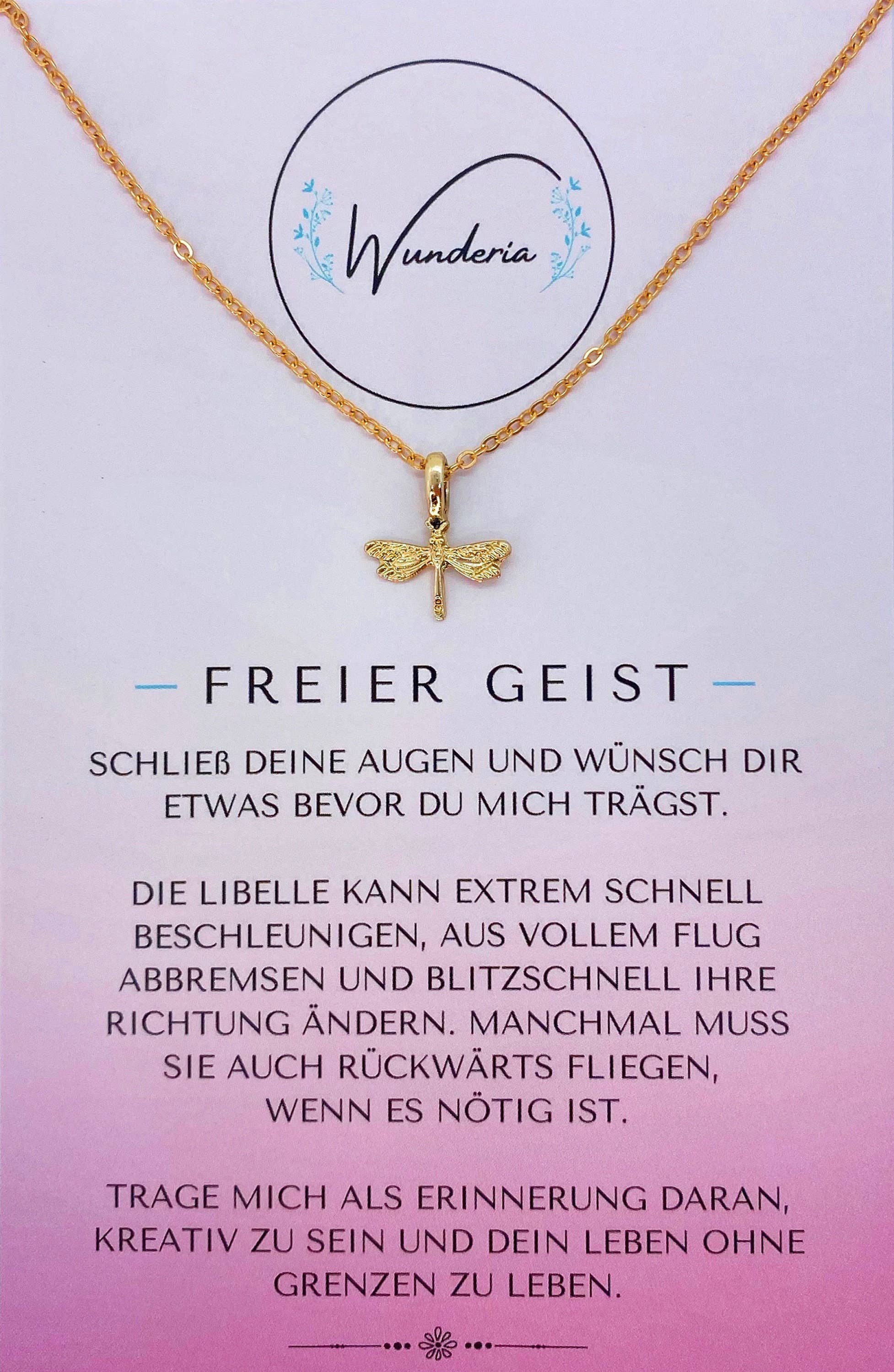 ♥ Ønsker går i opfyldelse med vores fortryllende ønskekæde - Free Spirit ♥ Vandnymfer er yndefulde væsner: farverige, iriserende og en fryd for øjet. Ingen anden insekt kan flyve som vandnymfen. Vær som en vandnymfe! Vær kreativ, farverig, og gør, hvad der er godt for dig. Husk at leve dit liv frit og uden begrænsninger med vores halskæde. Med vores ønskekæde kan du give en gave med lidt magi og især positive vibes. Før halskæden sættes på, skal du ønske dig noget. Ud over denne filigrane halskæde medfølger også et ekstra kort med ordene ”You are a Wunder”. Hvad mere er der at sige?! Kædefarve: sølv Kædelængde: 50 cm Vedhængsmål: B 1,5 cm x L 1,1 cm Pakningsmål: 9 cm x 13 cm Materiale: zinklegering (nikkelfri) Indhold: halskæde med vedhæng, 2 postkort