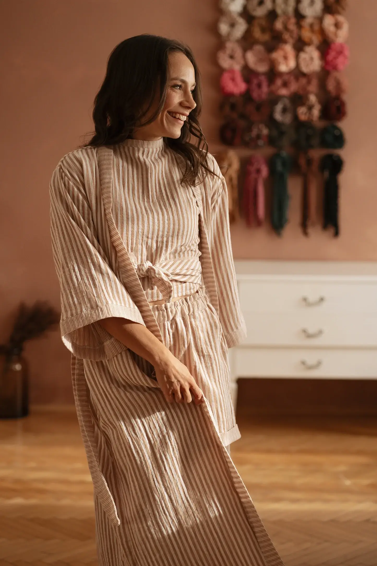 Tid til at slappe af og tage tid til dig selv. En behagelig og luksuriøs håndlavet badekåbe, lavet af det blødeste linned, der vil få dig til at føle dig afslappet og forankret. Tag et øjeblik til at forkæle dig selv, nyd en kop af din yndlingsdrik, og værdsæt det særlige øjeblik i dit liv. Badekåben fås i to størrelser: S-M: 122 cm om talje og hofter. M-L: 130 cm om talje og hofter. Du kan vælge mellem knælængde på 100 cm, midt-længde på 120 cm eller ankel-længde på 144 cm. Badekåben er designet i en kimono-stil, så den er så behagelig som muligt.