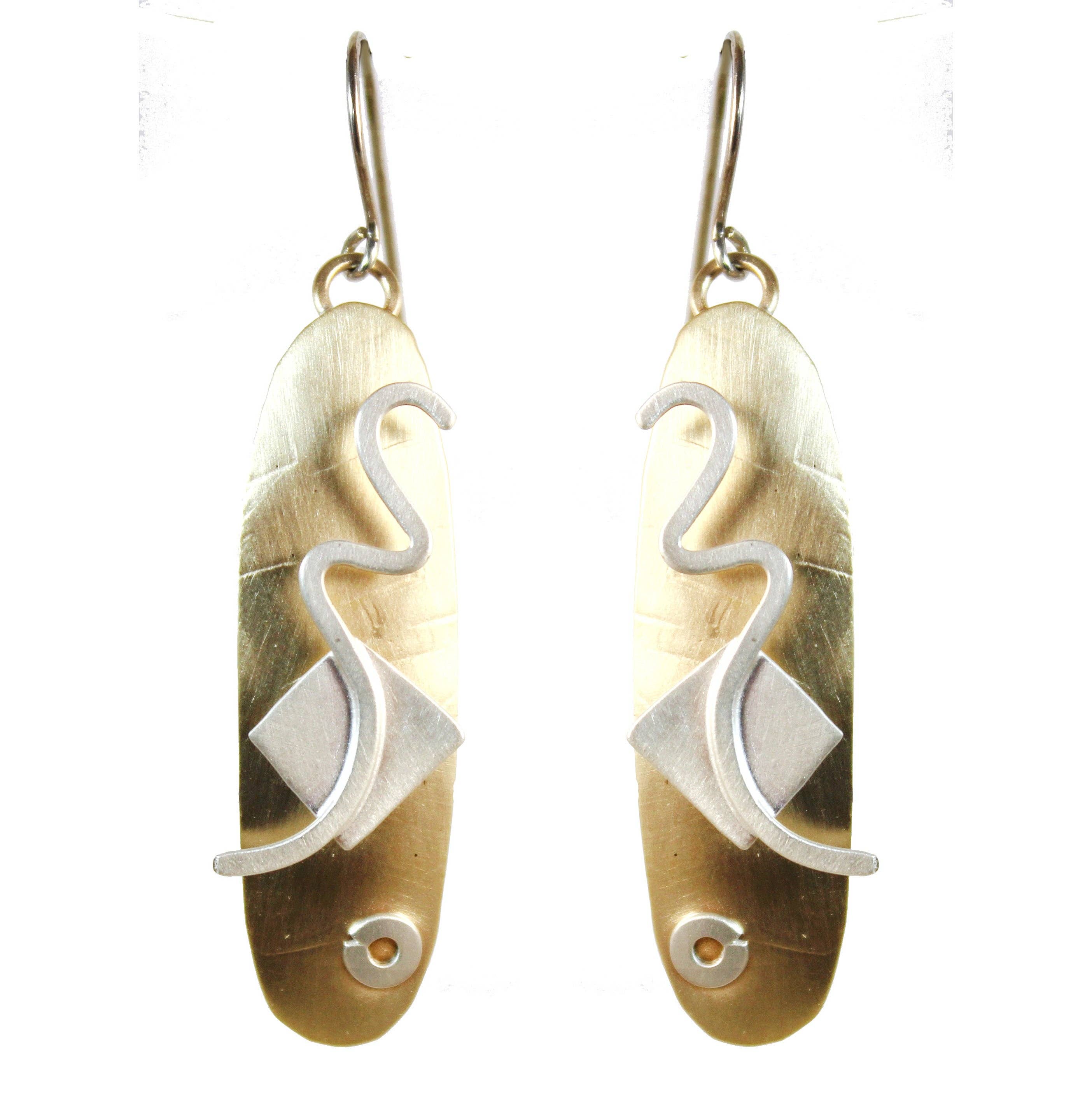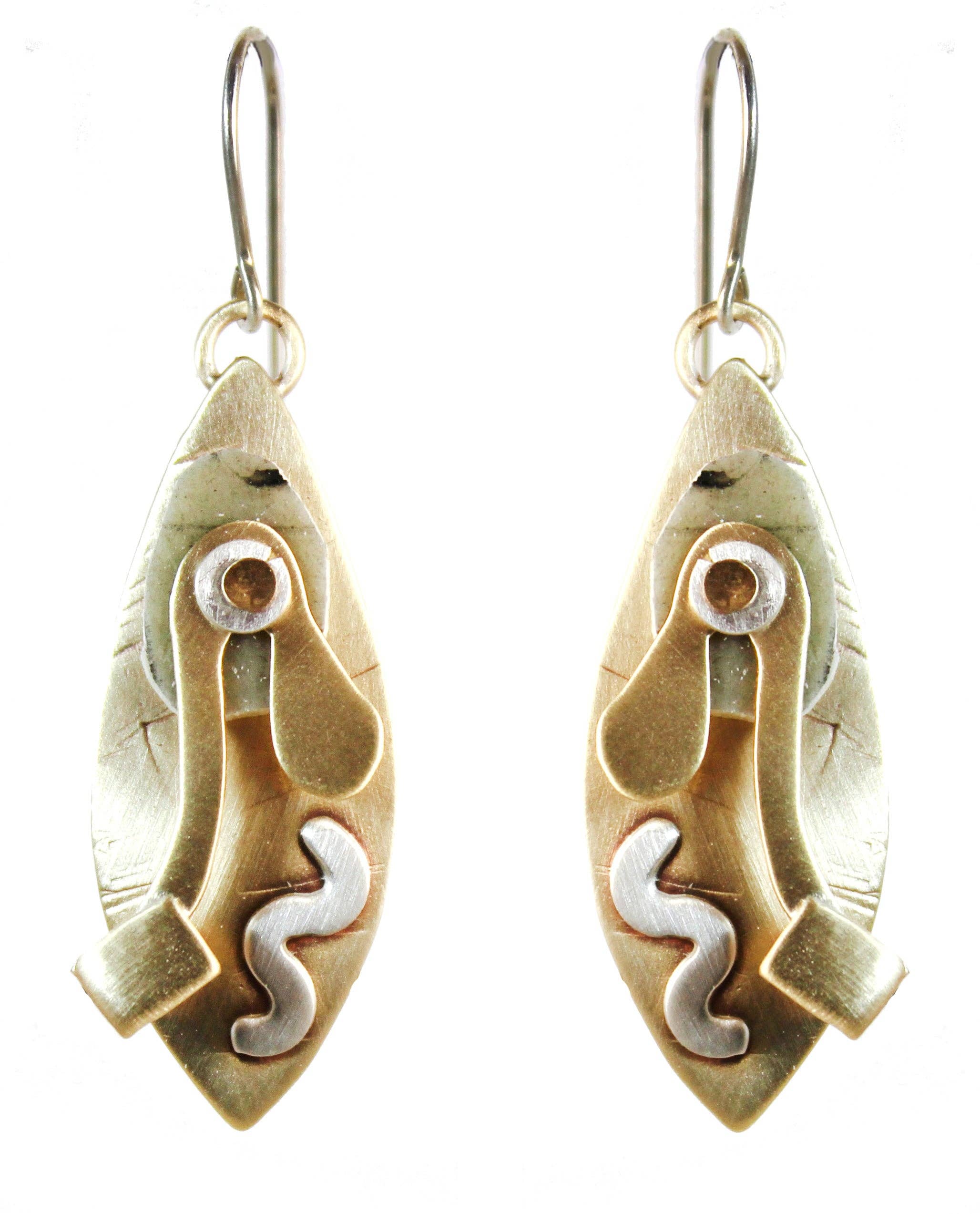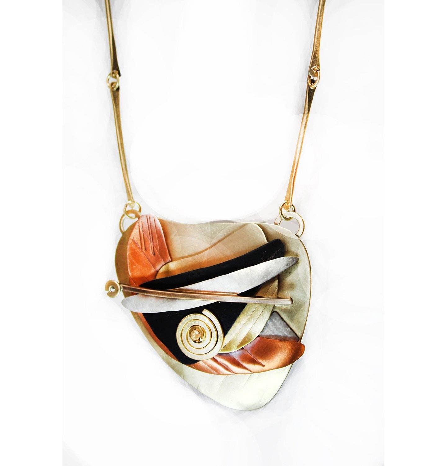 En kombination af sterlingsølv, messing og præget polymerler. Værker inspireret af Joan Miro. Lagdelte udtryk af glæde og bevægelse, alt sammen på en rund sort lædersnor 16" - 18" x 2". Håndlavet i Sarasota. Matcher øreringe E3773.