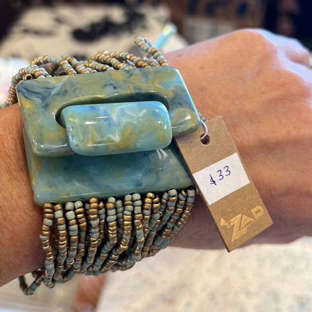 Tonal blå perler med en marmoreret ansøgning giver dette armbånd udseendet havet. Let og behagelig, det ser fantastisk ud på både kjole op og afslappede dage. • Firkantede glasperler med malet finish • Fem rækker spændt på elastisk sort elastik • Let at glide af og fra • Håndlavet i Indien • Målinger (ca.) 1" bred • Materialer Glasperler