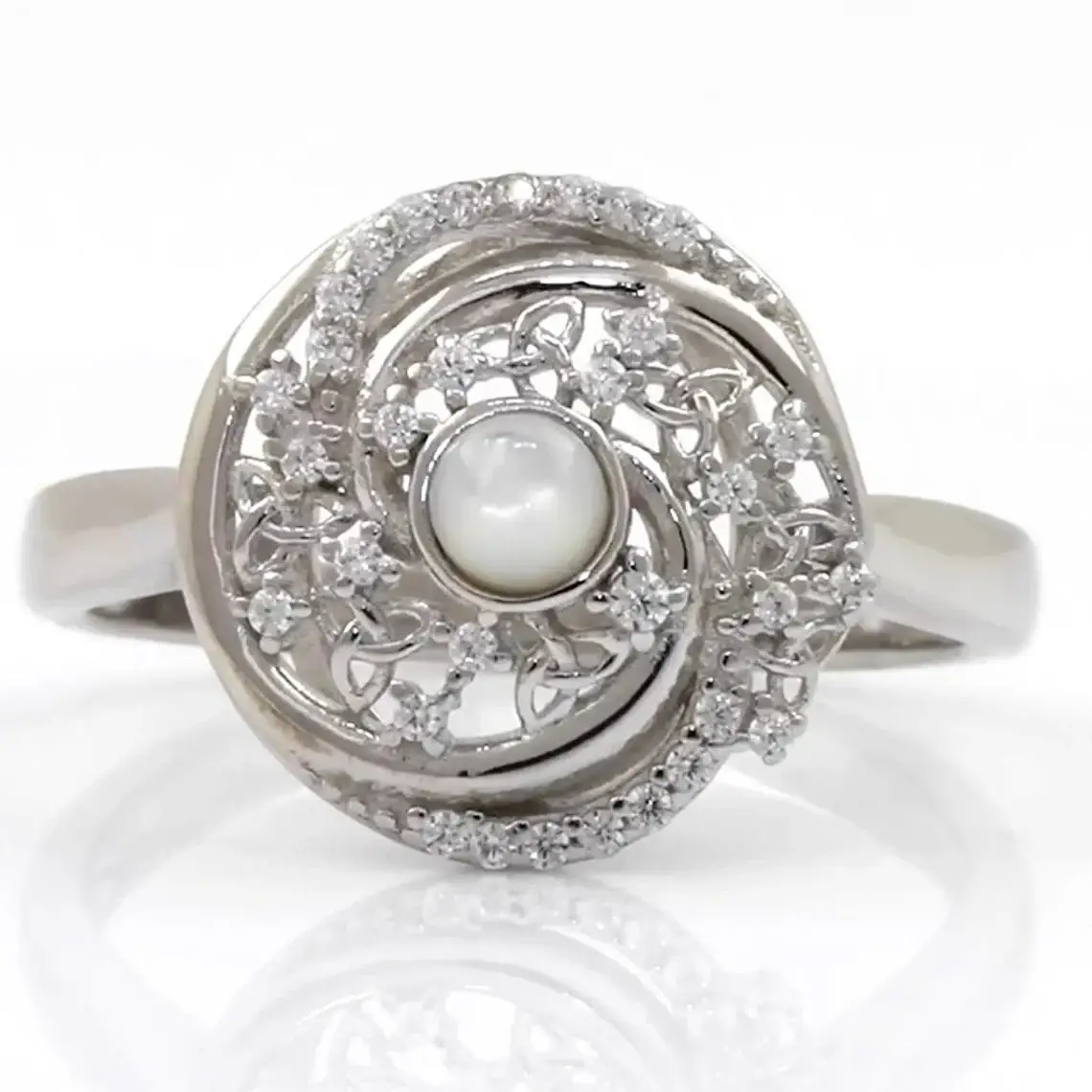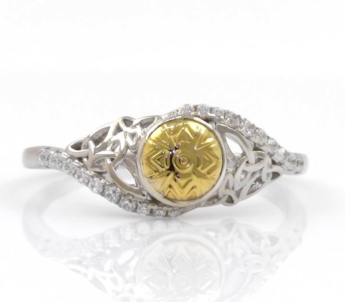 Fejr keltisk arv med Peridot Gemstone Trinity Knot indgraveret ring i sølv. Denne ring har et fængslende design prydet med flere triquetras, det ikoniske symbol på den hellige treenighed i irsk kristendom. I hjertet ligger en dråbeformet peridot-ædelsten, der tilføjer et levende strejf af grønt, der gentager de frodige landskaber på Emerald Isle. Peridot er værdsat for sine associationer med held og lykke, velstand og beskyttelse, hvilket gør denne ring ikke kun til et slående tilbehør, men også en meningsfuld talisman af positiv energi. Denne ring er lavet af 100% sterlingsølv og er designet til at holde i generationer. Sterlingsølvet giver en strålende glans og er rustbestandigt, hvilket sikrer, at det forbliver et blændende stykke i din smykkekollektion. Med en bredde på 0,6" på det bredeste punkt giver denne ring et dristigt statement, mens den tilspidses yndefuldt. Dens alsidige design overgår problemfrit fra hverdagsbrug til specielle lejligheder og forbedrer ethvert ensemble.