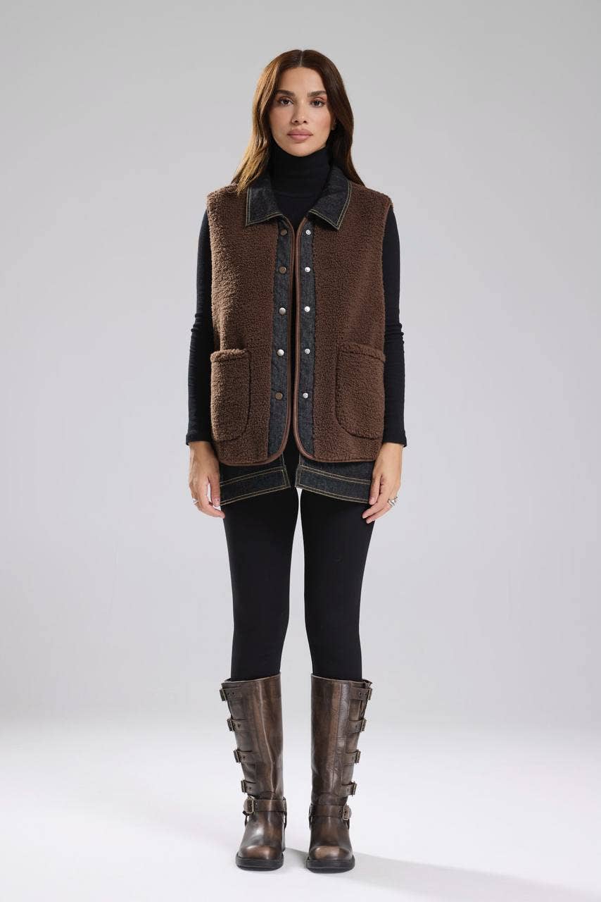 Overdimensioneret brun jakke i imiteret ruskind med høj krave og bælte
