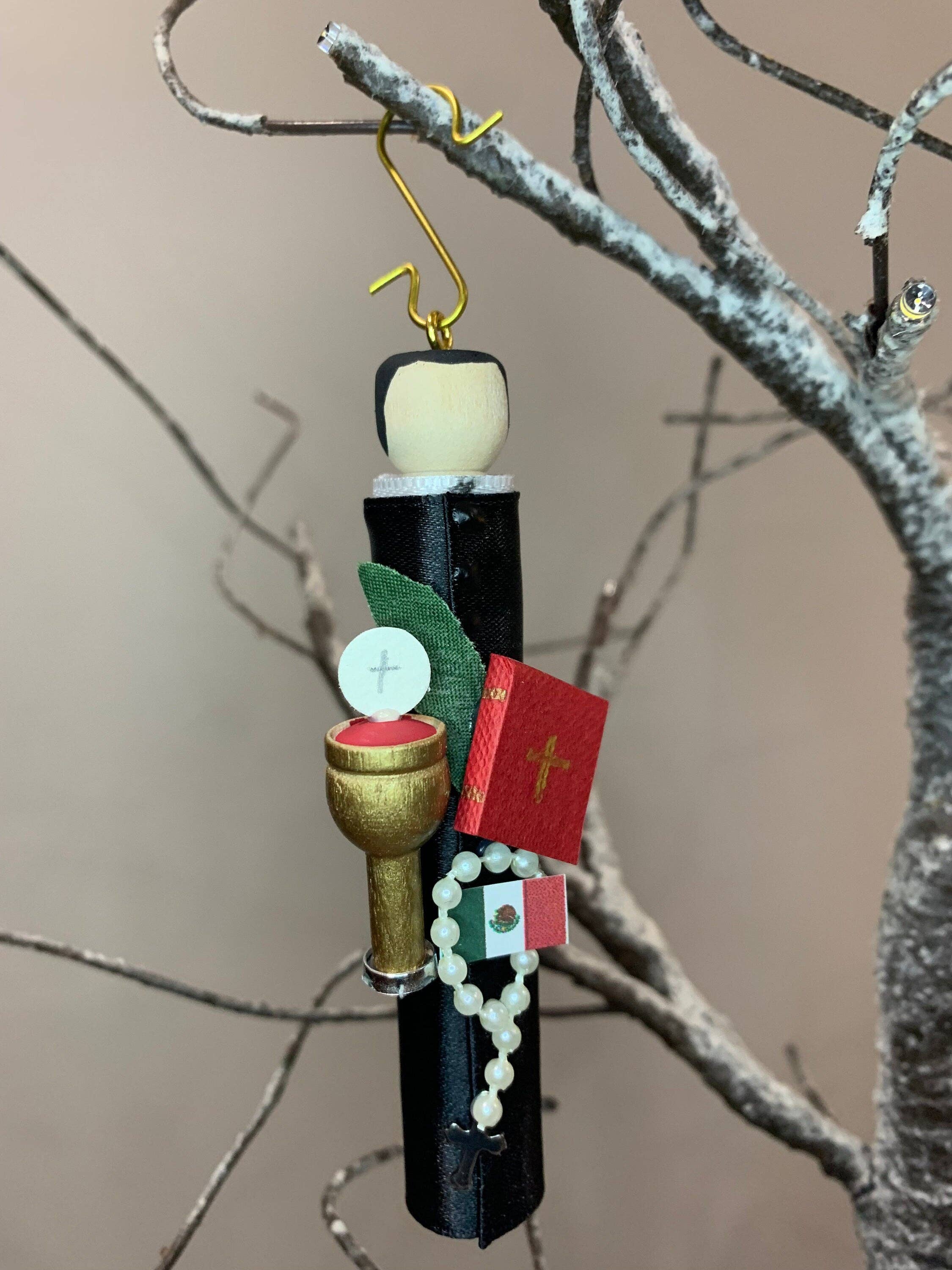 Håndlavet originalt ærværdigt Fulton Sheen trædukkeornament. Perfekt til juletræet. Bring ud på hans festdag eller til en Novena. Gave til en fødselsdag eller nadveren (dåb, første kommunion, konfirmation, hellige ordrer, ægteskab) fest. Lærer, præst, bedsteforældres gave. Han blev født i Illinois i 1895 og var en 8-årig alterdreng, da han efter at have droppet vinkruet ved en biskopsmesse fik at vide, at han en dag ville studere i Belgien og selv blive biskop. Han blev ordineret i 1919 og studerede i Belgien, før han underviste på Det katolske universitet i 23 år. Da han rejste rundt i USA, nåede hans oratoriske færdigheder ud over campus med ugentlige foredrag om The Catholic Radio Hour fra 1930-1950.