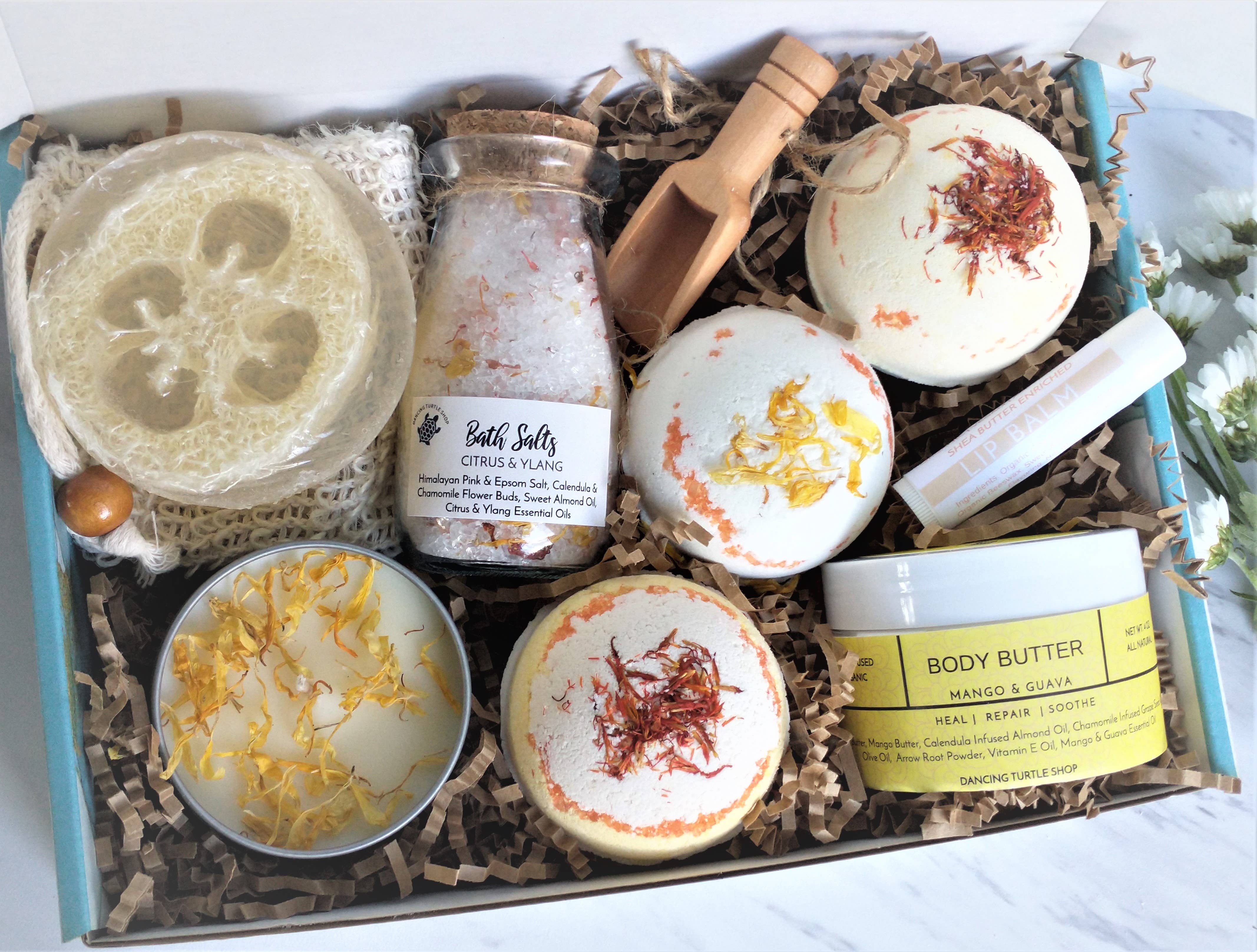 Send din mor, kone eller din kæreste den ultimative naturlige spa-gaveæske! Kun de bedste forkælelsesprodukter til dig eller den person, du holder af. Denne gaveæske til selvpleje til kvinder er den perfekte gave til dig selv eller til nogen speciel i dit liv. Forfriskende og luksuriøs, en ægte spa-oplevelse fanget i et gavesæt. Nyd fordelene ved dette naturlige lavendel spa-gavesæt uden at skulle bekymre dig om hårde ingredienser/kemikalier. Spa Gavesæt indeholder: ❀ 3 x Organic Large Aromaterapi Bath Bombs 4.0 oz (lavendel vanille, lavendel mynte & lavendel blomster duft) ❀ 4 oz Organisk Glycerin Loofah Soap Bar (lavendel duft) ❀ Naturlig sæbe Saver Pouch ❀ 4.oz Organisk Ultra Fugtgivende Lavendel & Calendula Infused Body Butter (lavendel vanilje duft) ❀ 3.4 oz Himalaya Pink, Dead Sea Salt, Epsom badesalt, lavendel & kamille blomster med træske (lavendel mynte duft) ❀ Organisk sheasmør beriget læbepomade ❀ 4,0 oz Aromaterapi Candle (lavendel luksus duft)