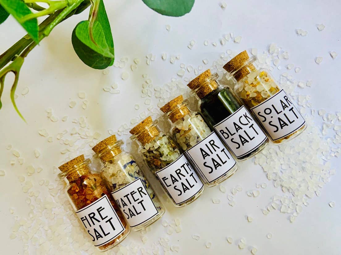 Hvert sæt leveres med 6 flasker salt inklusive: Sort salt Brand salt Solar salt Luft salt Vand salt Jord salt Alle urter, krydderier eller kuriositeter er håndvejet og kun beregnet til håndværk og magisk brug. Se vores FAQ for fuld ansvarsfraskrivelse. © Moon Street Kits │ Alle rettigheder forbeholdes