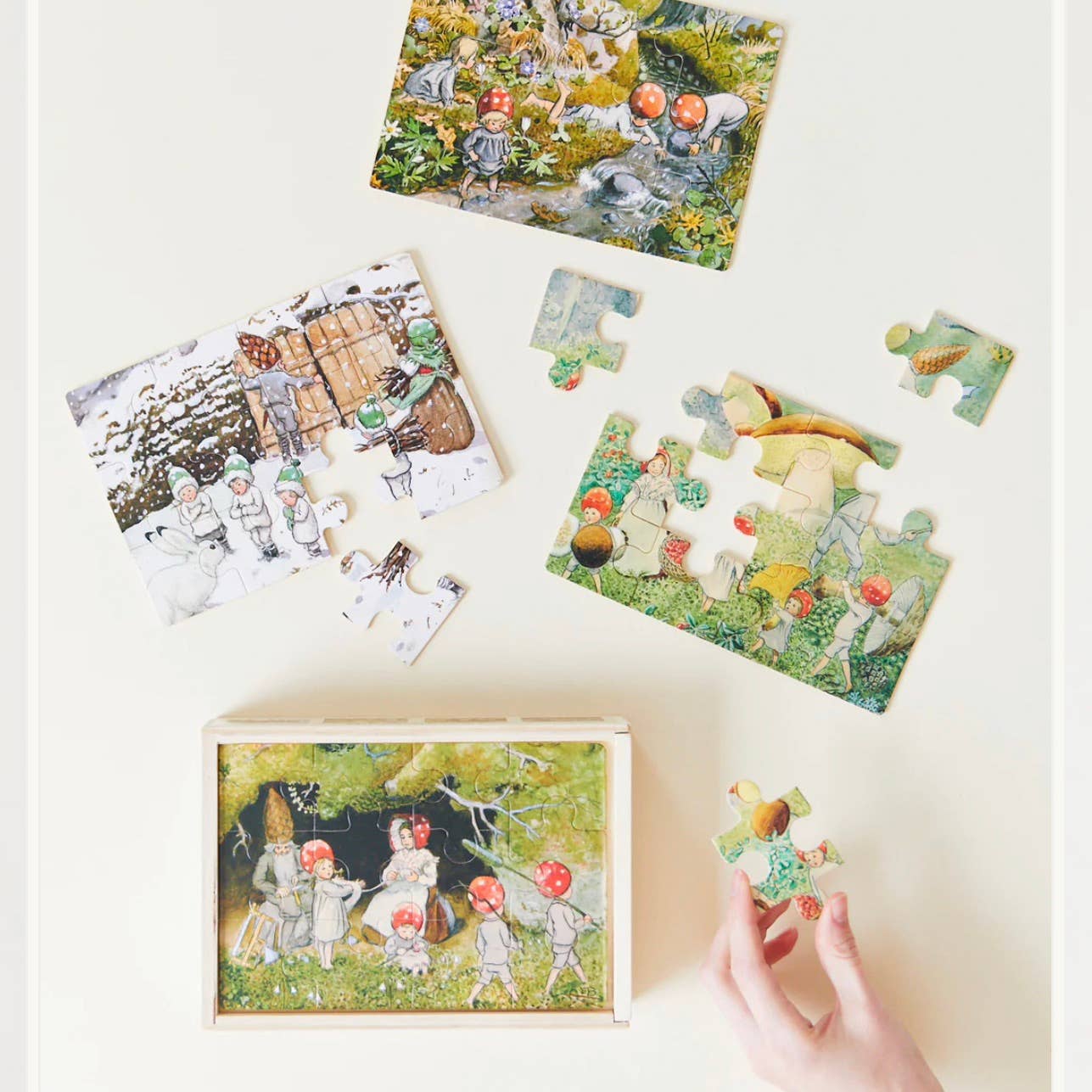 Seks puslespil scener fra Elsa Beskows Børn af skoven (Tomtebobarnen) børnebøger. Elsa Beskow var en svensk børnebogforfatter og illustrator og meget populær blandt Waldorf skolefamilier. - Cube størrelse: 1-1/2 „ - Afsluttet puslespil størrelse - 6x4.5x1.5“ -Materiale: Træ blokke - Antal blokke: 12