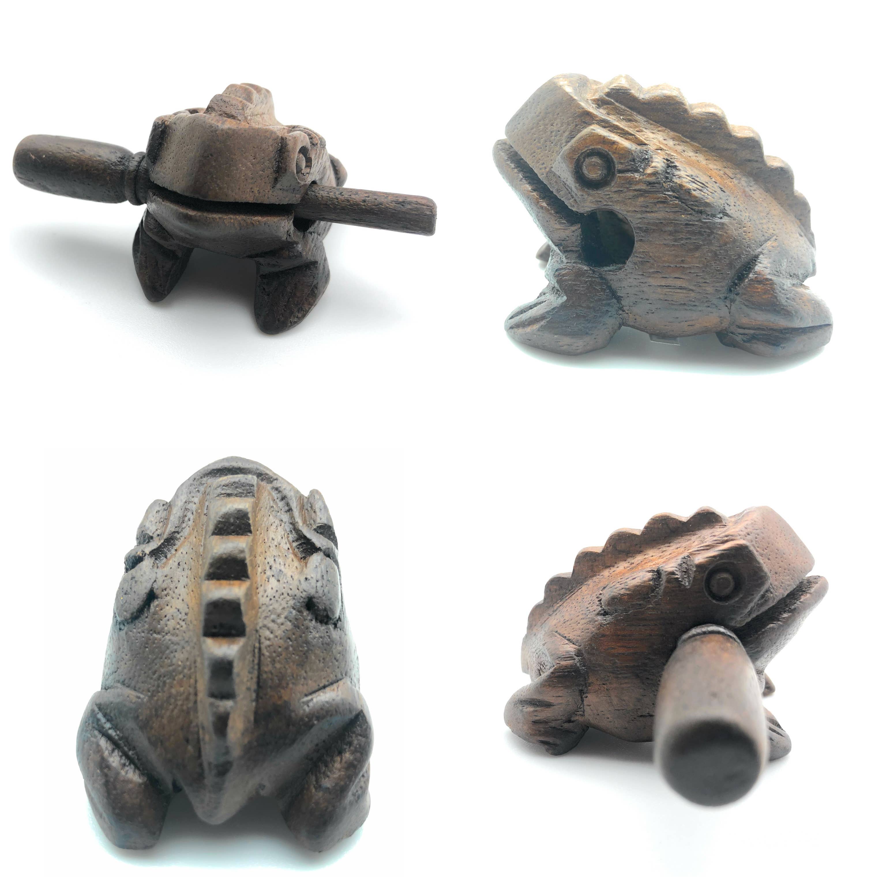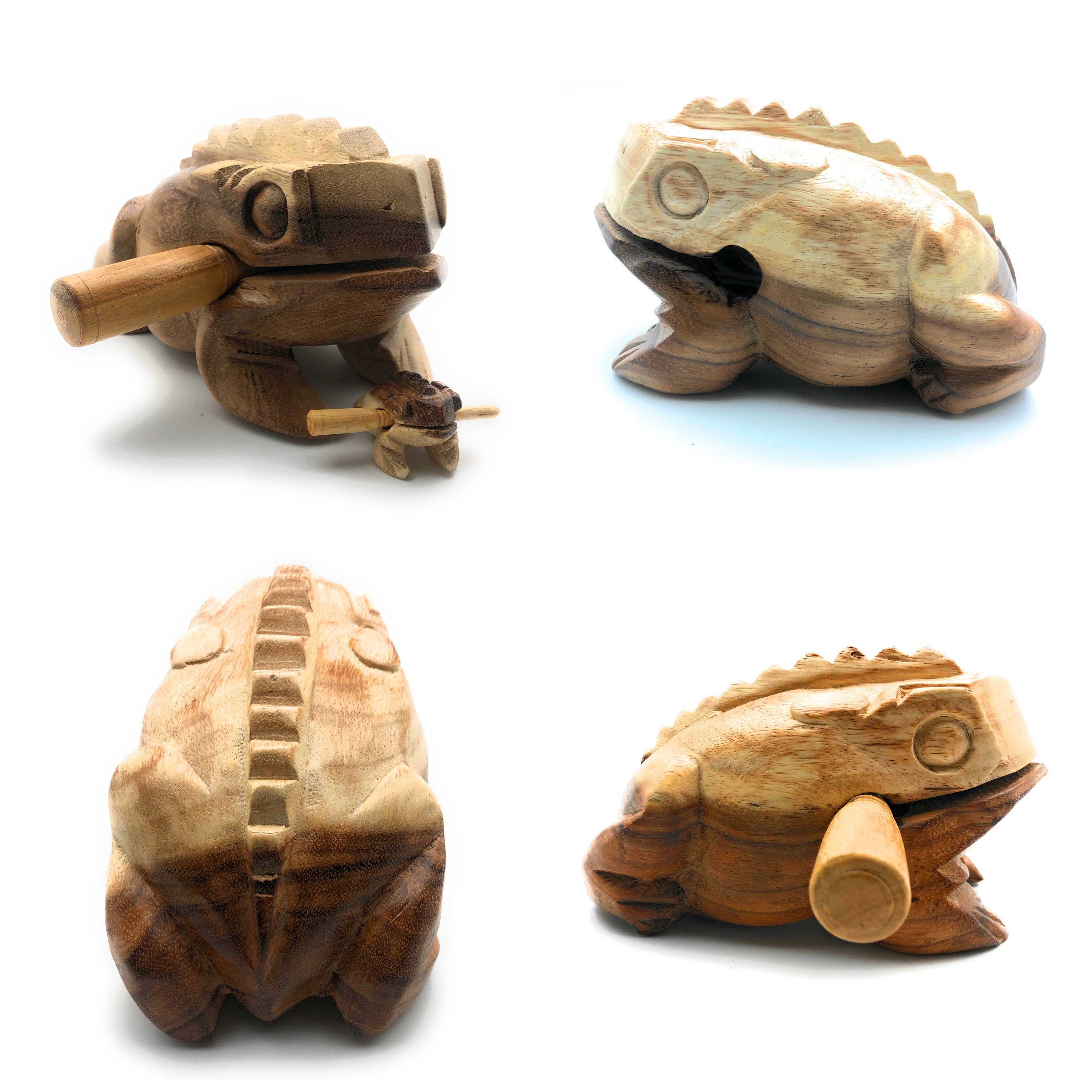 Vores naturlige klare voksede 1,5 tommer kvækkende syngende musikalske frøtrommerasp er vores perfekte frø i lommestørrelse. Et fantastisk musikinstrument slagtøj fra træ, der „ribber“, når du gnider den medfølgende angriber op ad ryggen. (Fås i mange størrelser og farver).