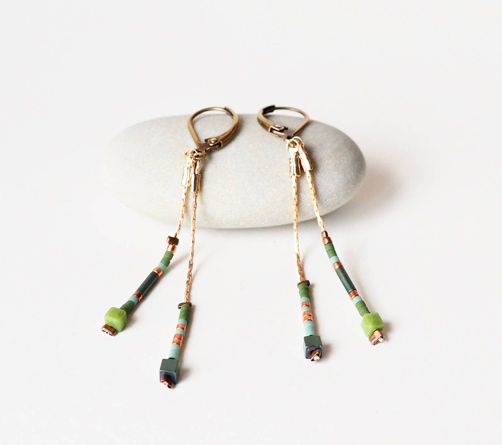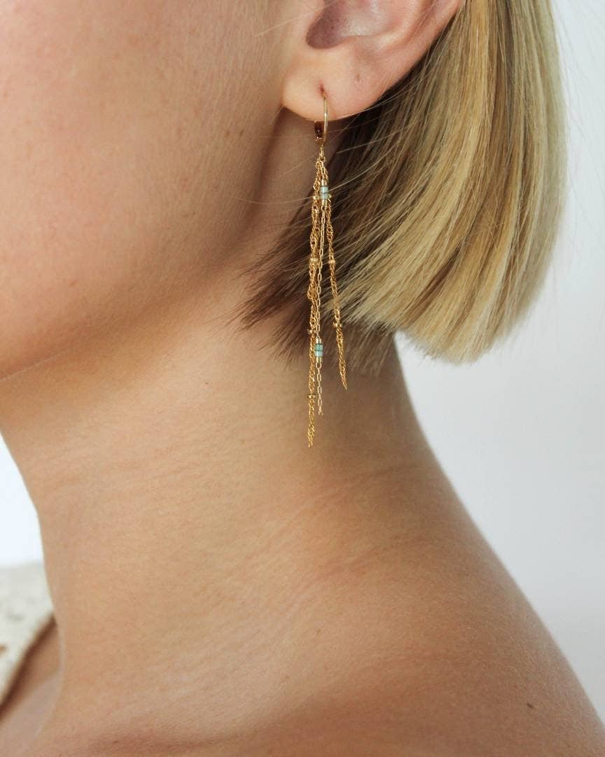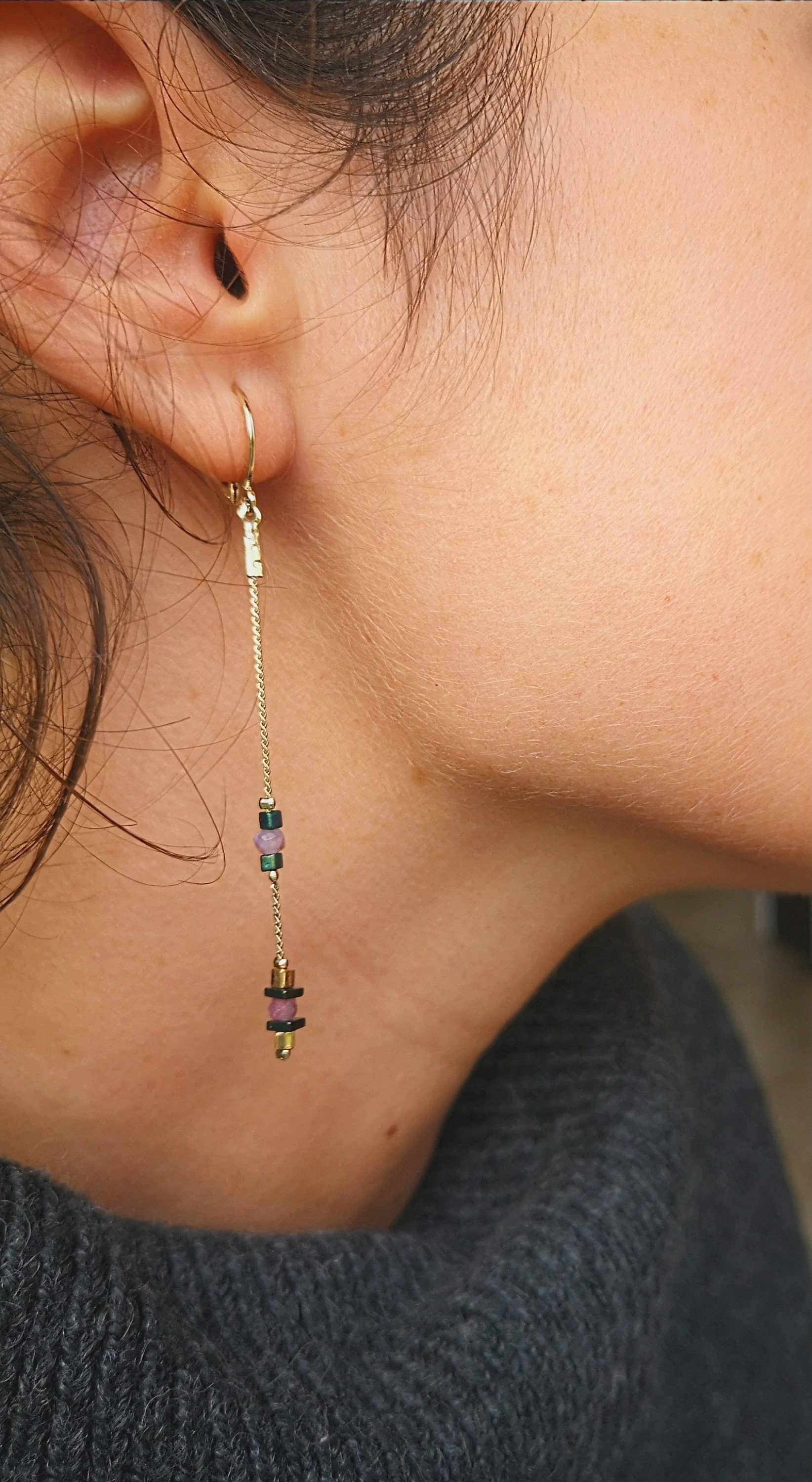 Fine, lange, elegante øreringe i minimalistisk design med fine guldindfattede natursten, håndlavet