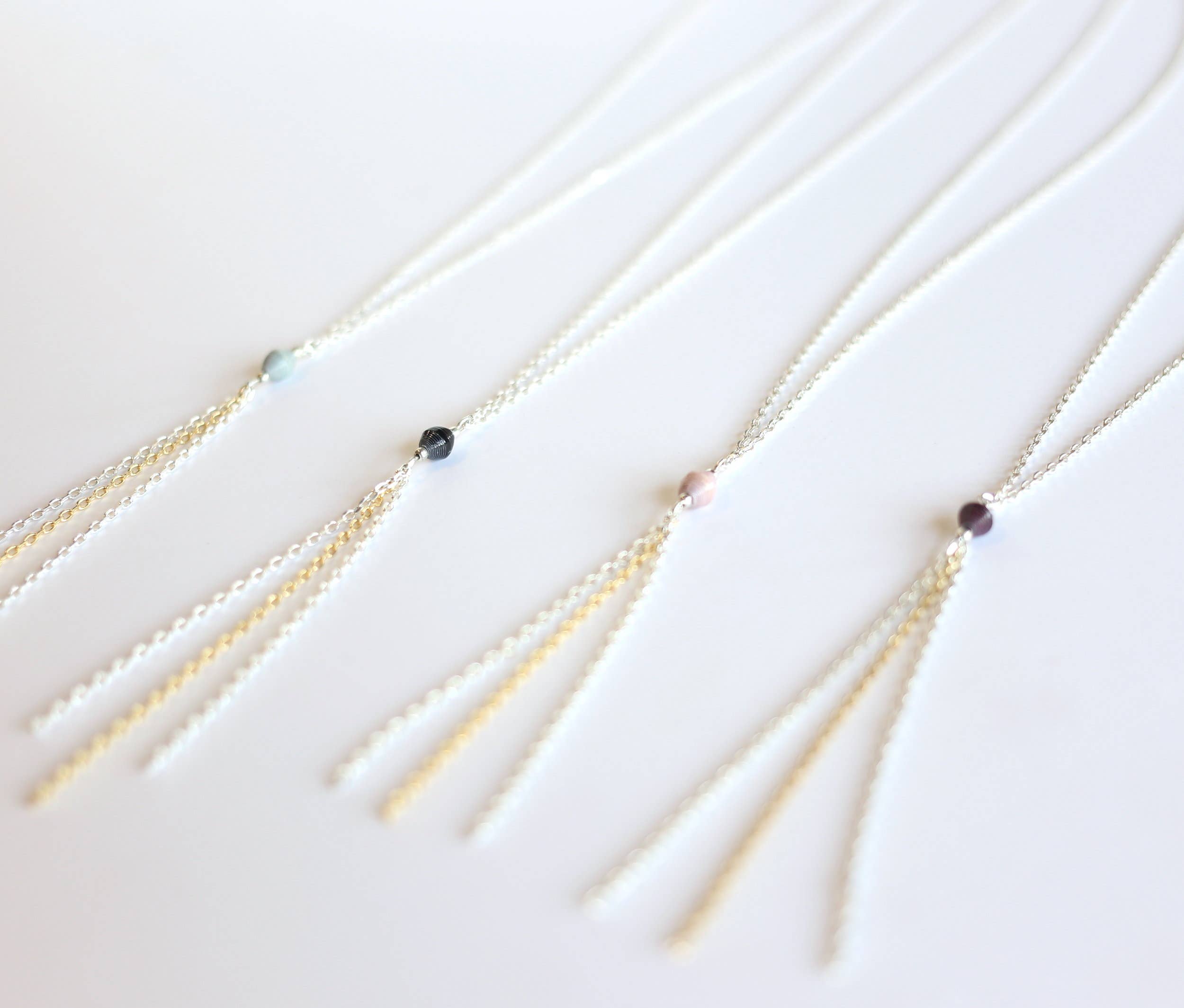 Bib stil endnu delikat. En favorit stykke til erklæringen-making. Par den med en tee for at klæde den ned eller putte den væk til en særlig lejlighed. Sterling Sølv Plating, Håndlavede Papir Perler 16 „rundt om halsen. Længste chain ~8" fra neck.