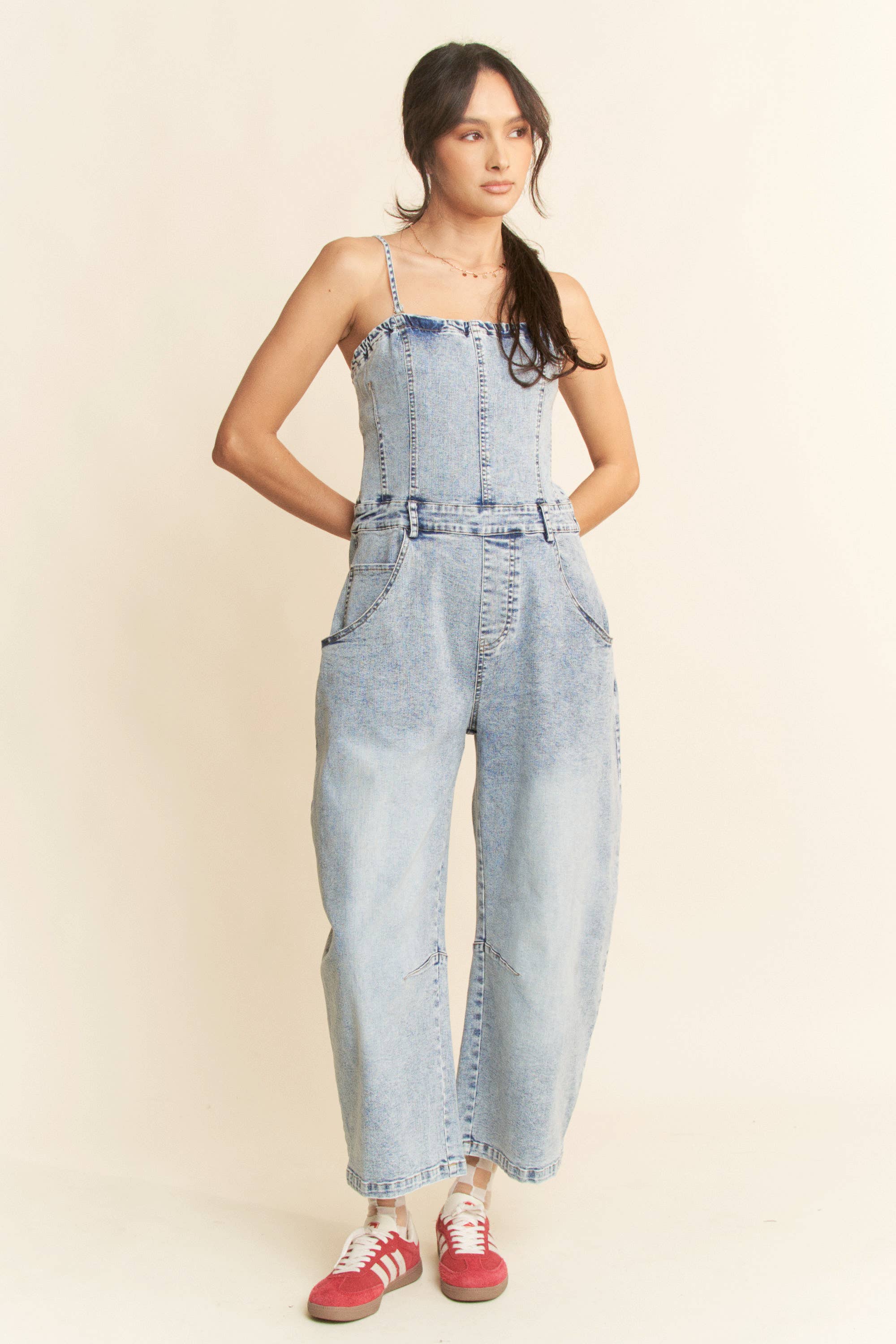 PLUS TØJ VASKET RUCHED BODICE TIE BACK TOP BREDE BUKSER JUMPSUIT 100% POLYESTER Modellen er iført 1X Højde: 5'10“ Buste: 42C Talje: 38“ HiP'er 45"