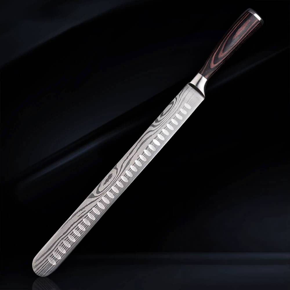 Shogun 12" Brisket Knife er højdepunktet inden for knivfremstilling og er individuelt smedet af 67-lags japansk Damaskus stål med en HRC-vurdering på 62 for uovertruffen hårdhed og ydeevne. 33-lag Damaskus på hver side omgiver den japanske VG10 Steel Core. Bygget til at holde og bevare skarpheden, så du aldrig har brug for en anden brystkniv igen. Skær rent gennem bryst, kød, stege og endda stor frugt med ubesværet præcision. Selve håndtaget er et G10 Full Body-håndtag, der giver et fast, men behageligt greb for at gøre din hakning så ubesværet som muligt. Specifikationer: Bladlængde: 12 tommer Samlet længde: 16.75 tommer Bladbredde: 1.625 tommer (4.12cm) på det bredeste punkt Tykkelse: 2mm Vægt: 10,8 oz (306 g) Leveres i en luksuriøs gaveæske til nem gave og smuk præsentation.