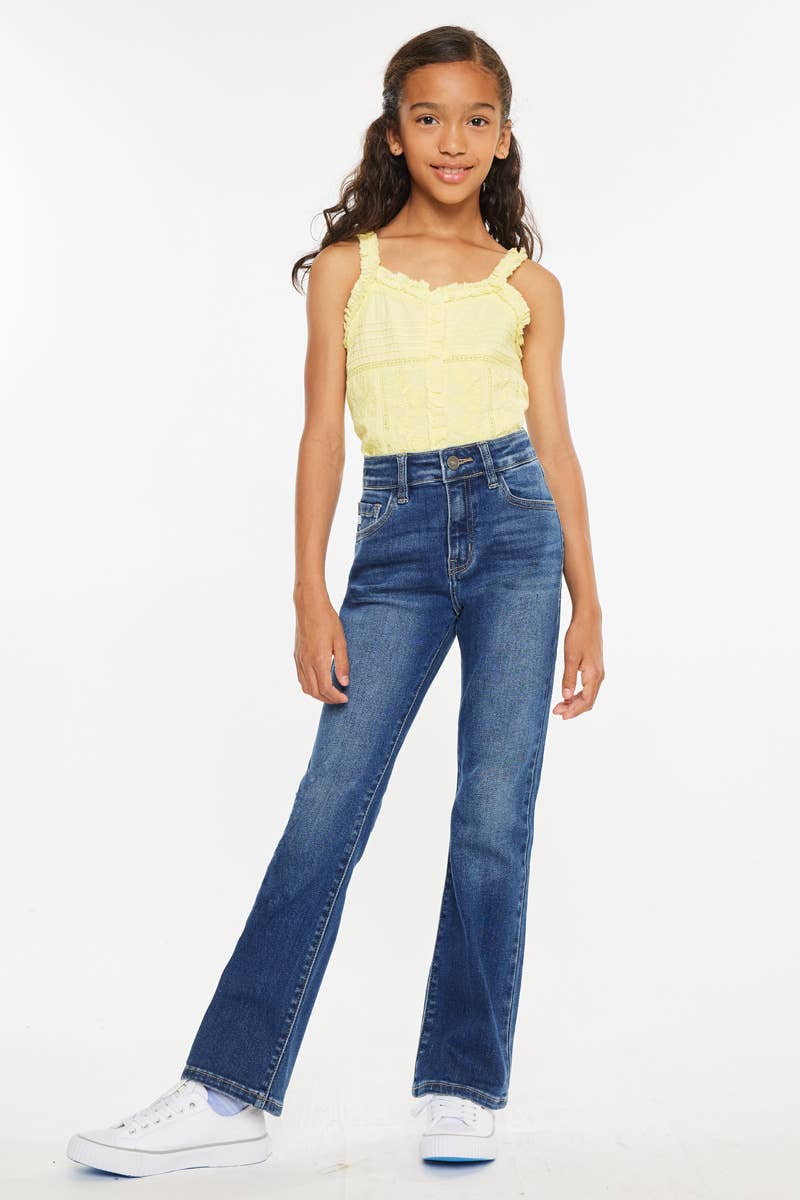 OPEN PACK UNGDOMS HIGH RISE CROP BOOTCUT PIGE BØRN MEDIUM STENVASK STRÆKKE FRIGIVET HÆM 5 LOMME LYNLÅS FLUE RISE 9“ INDERSØM 23 1/2 „I STR. 5 75% BOMULD, 23% TENCEL 2% SPANDEX 13,5 oz