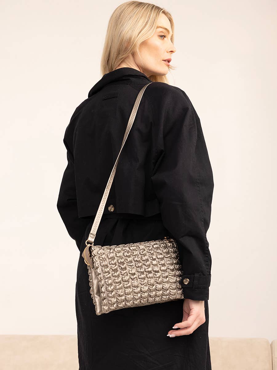 Vare Detalje -Dekorative Frontspænder: Tilføjer stilfuld struktur og flair -Konvertibelt Design: Brug den som en clutch eller skuldertaske -Justerbar/Aftagelig Rem med Trykknapper: Tilpasningsbar til din foretrukne bærestil -Kompakt & Alsidig: Ideel til nødvendigheder som telefon, nøgler og kort Dimensioner: -Længde: 10 tommer -Højde: 5 tommer Winnipeg Justerbar Skuldertaske er en slank, kompakt clutch-stil taske med lige den rette mængde kant. Med dekorative frontspænde accenter og en aftagelig trykknap-rem er den perfekt til dem, der ønsker en stilfuld håndfri mulighed eller et elegant håndholdt look. Efterår/Vinter Kollektion