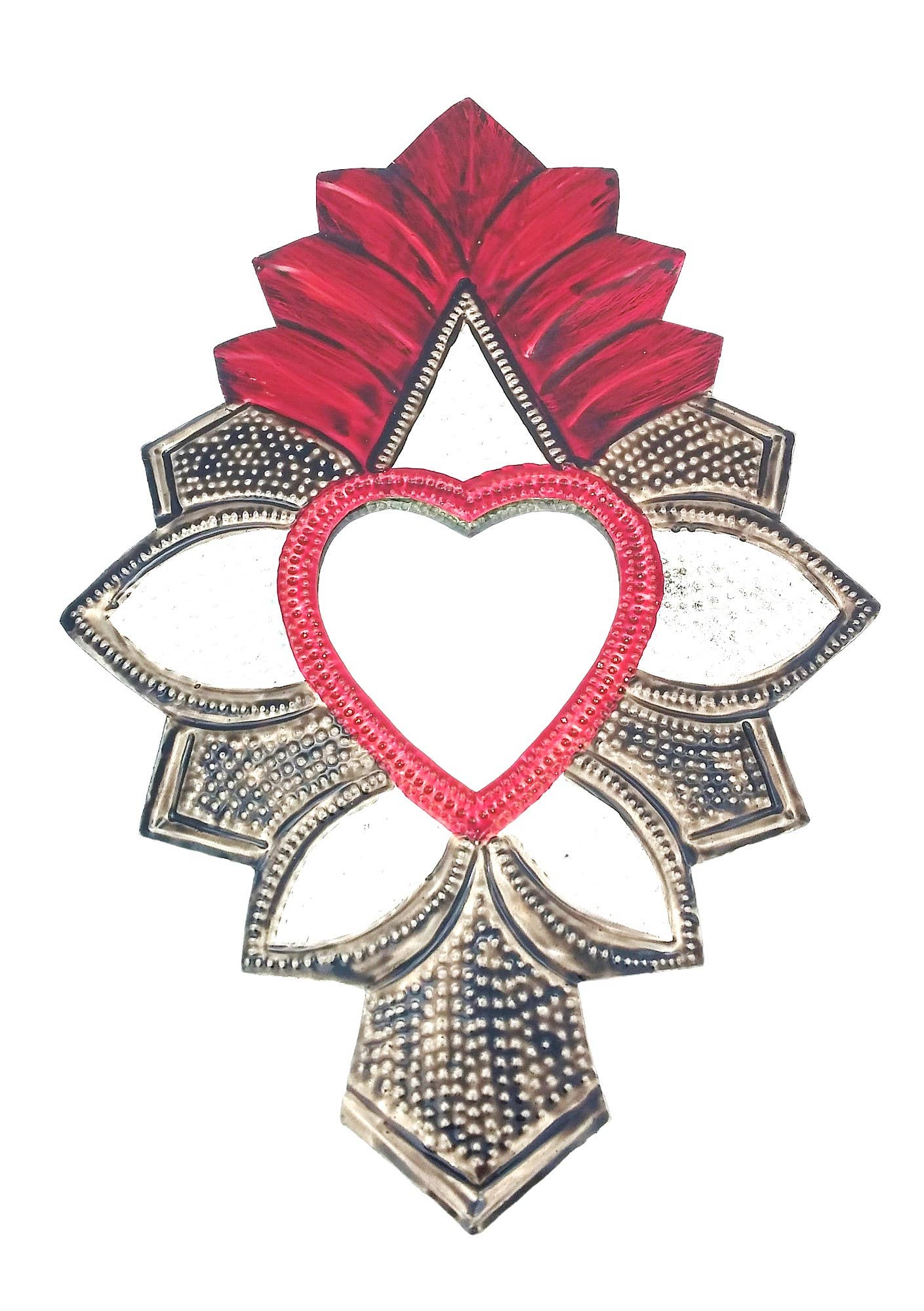 Dette seje hjerte af tin med vinger og spejl er den perfekte dekorative detalje til enhver sæson og hverdagens boligindretning. Håndlavet af holdbart tin, det er en ideel gave eller en vidunderlig tilføjelse til ethvert rum. Disse vægophæng er omhyggeligt fremstillet i Mexico. Spejlet tilføjer et strejf af elegance og funktionalitet, reflekterer lys og forbedrer stemningen i ethvert rum. Perfekt til at tilføje en varm, indbydende følelse til dit hjem.