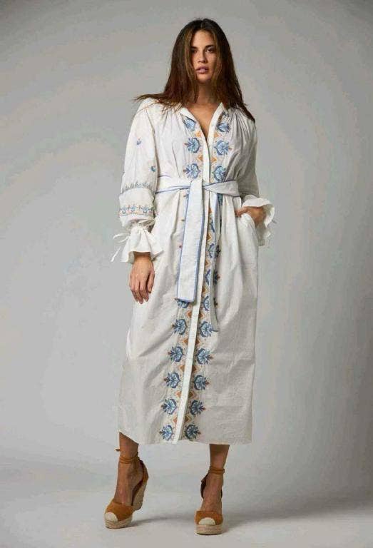 Håndlavet Lang Kjole i Bomuld med Lange Ærmer og Smukt Design til Kvinder. Materiale: 100% Bomuld Der er ikke 2 stykker ens. Da det er et håndlavet produkt, kan det variere fra billedet. One size. Fremstillet i Indien. Flere Overraskelser Lange ærmer, bælte og V-hals.