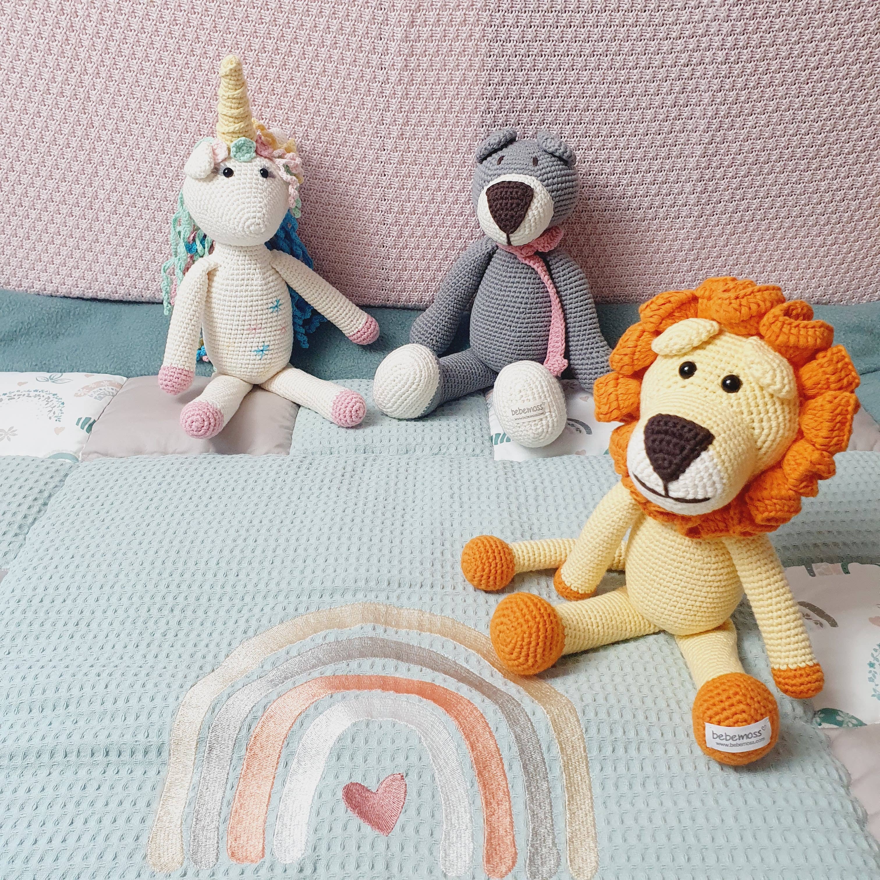Håndlavet, hæklet udstoppet dyr løve Helt håndhæklet i GOTS økologisk bomuldsgarn af vores håndværkskvinder. Lavet med GOTS økologisk bomuldsgarn, håndhæklet, fyldt med allergivenlig fyld Alder: 0-og fremefter Overholder legetøjs sikkerhedsstandarder Leveres i en individuel bomuldspose med bånd og et kort med navnet på den håndværker, der lavede legetøjet.