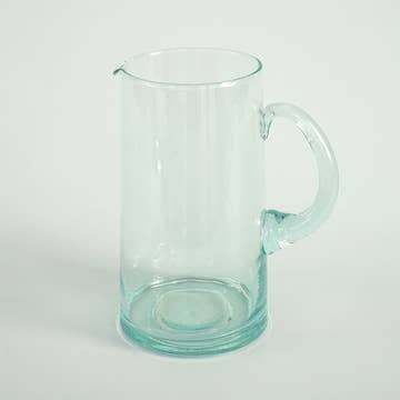 Vores halvkaraffel er perfekt til hældning. Men stop ikke der - dens eklektiske, boblede rygfunktion gør det til et utraditionelt kar til opbevaring af alt fra køkkenredskaber til tørret pasta til farverige buketter. Skift det op, eller få begge dele for uendelige muligheder. På grund af den håndlavede karakter af vores produkter er hvert et kunstværk; et enestående stykke med små variationer i farve, tekstur og form. Vores glasvarer er håndblæst i Marrakesh og lavet af genbrugsglas. Bæredygtighed har aldrig set så godt ud. Detaljer: Fås i tonet Crystal Clear Blue. Størrelse: __________ Vedligeholdelsesvejledning: Tåler opvaskemaskine og mikrobølgeovn