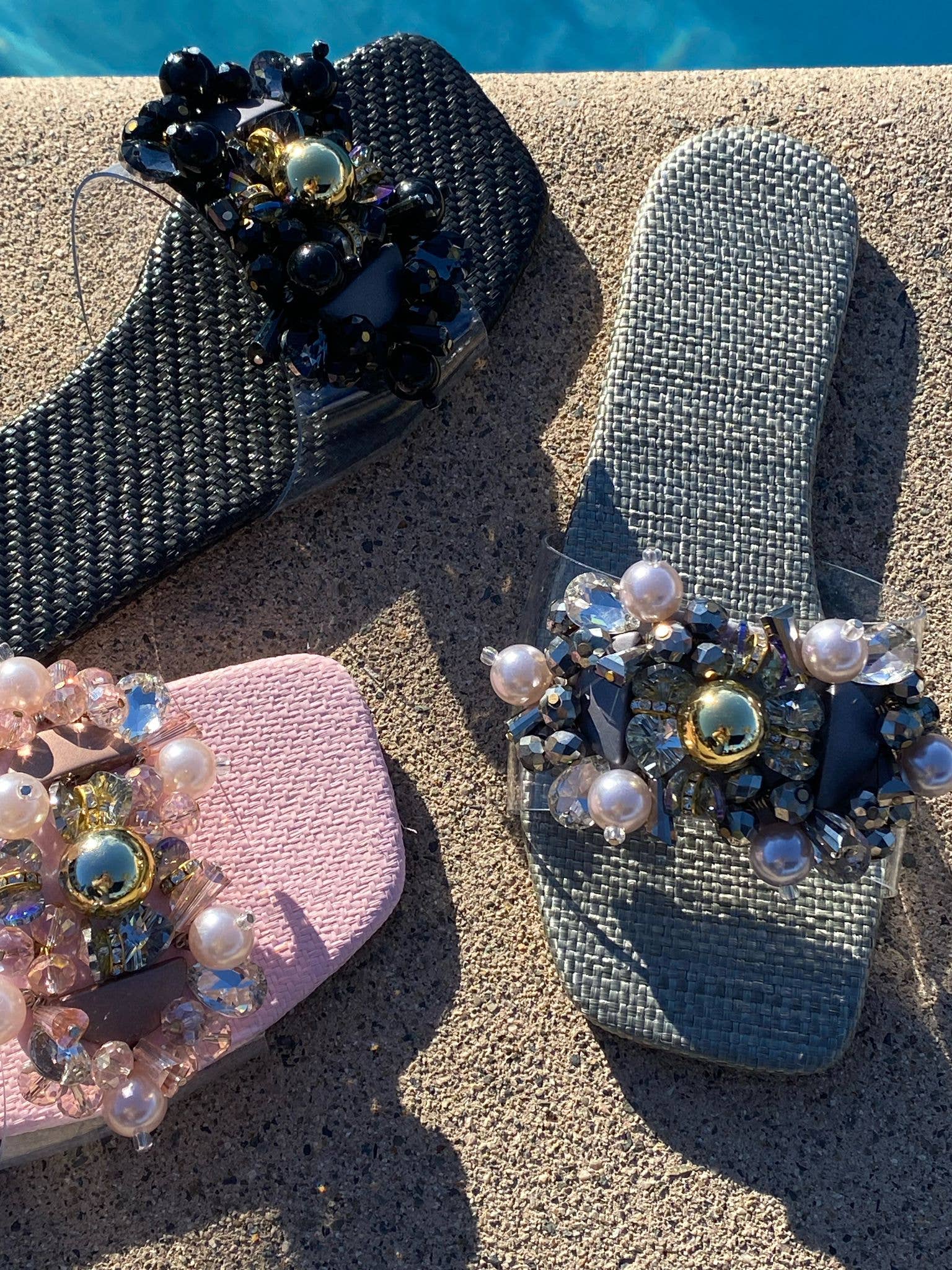 Sommer-sandal med flad sål dekoreret med detaljerede rhinsten. Fremstillet i materiale, der minder om raffia. Syntetisk materiale. Falsk læder/PU.