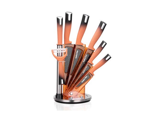 6,5“ Cleaver 8“ Kokkens kniv 8“ Brød kniv 5“ Utility kniv 3,5" Parring kniv Skrællekniv Kniv blyantspidser ABS+SS knivstativ PP håndtag med non-stick belagt klinge