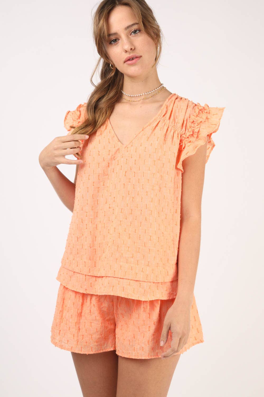 - Vatteret vasket behagelig striktop og shorts TOP - Behagelig top med rund hals til spildagen - Kort ærme - Rå kantskæring BUND - Høj talje - Elastisk talje - Sidelommer (Modelhøjde: 5"7", iført en Small, 2-2-2 størrelsesforhold, MEGET J/NEW IN)