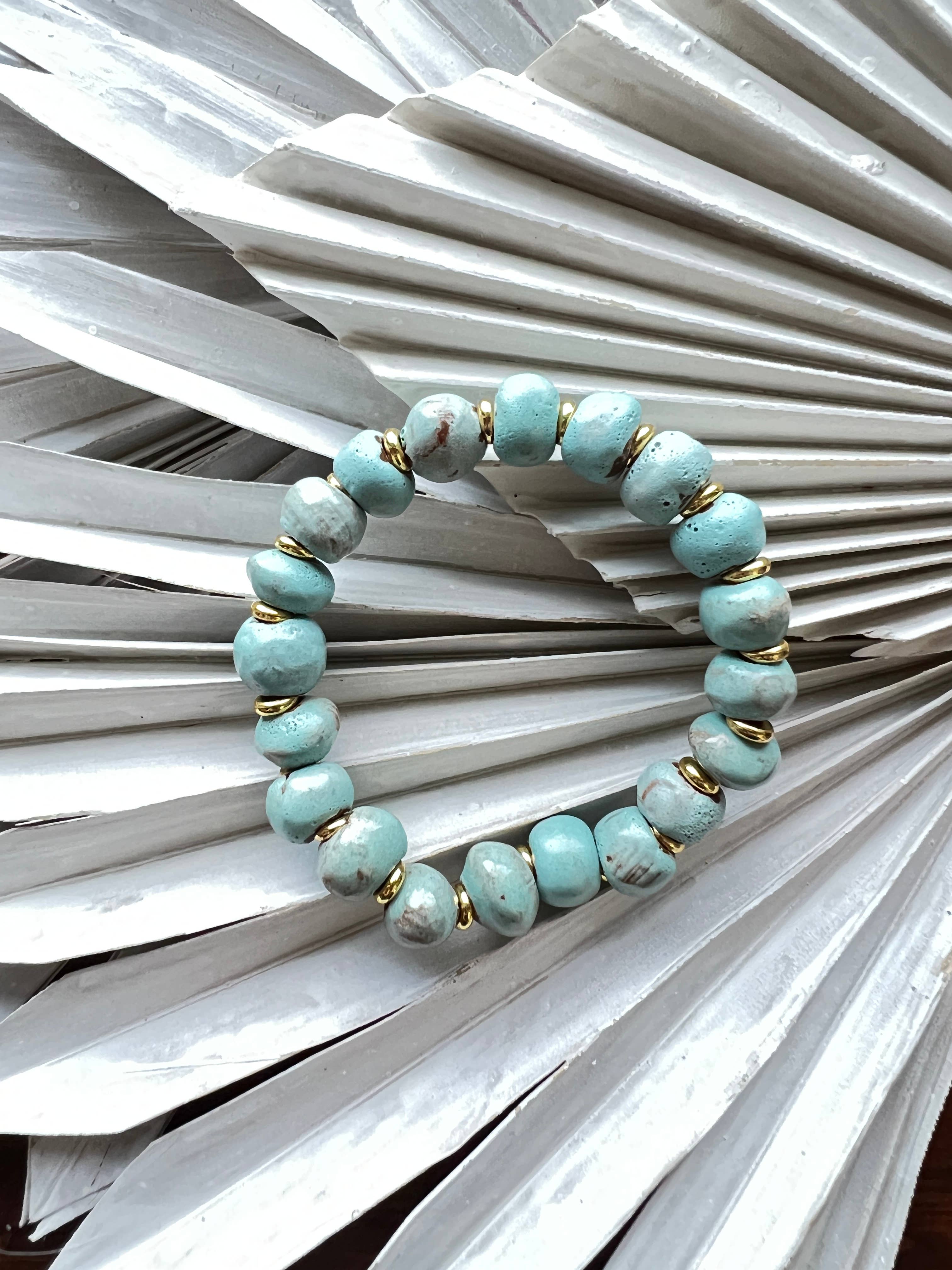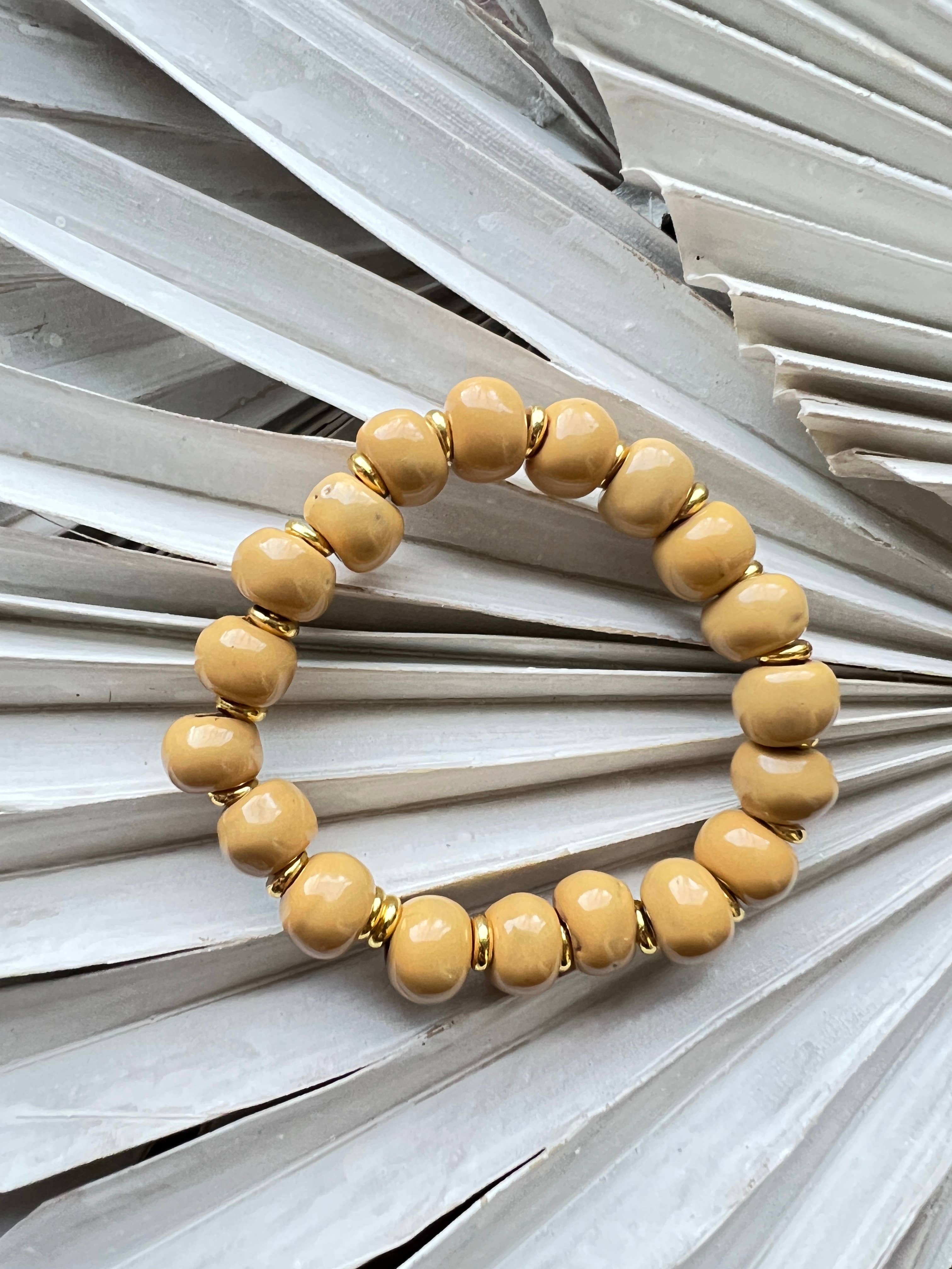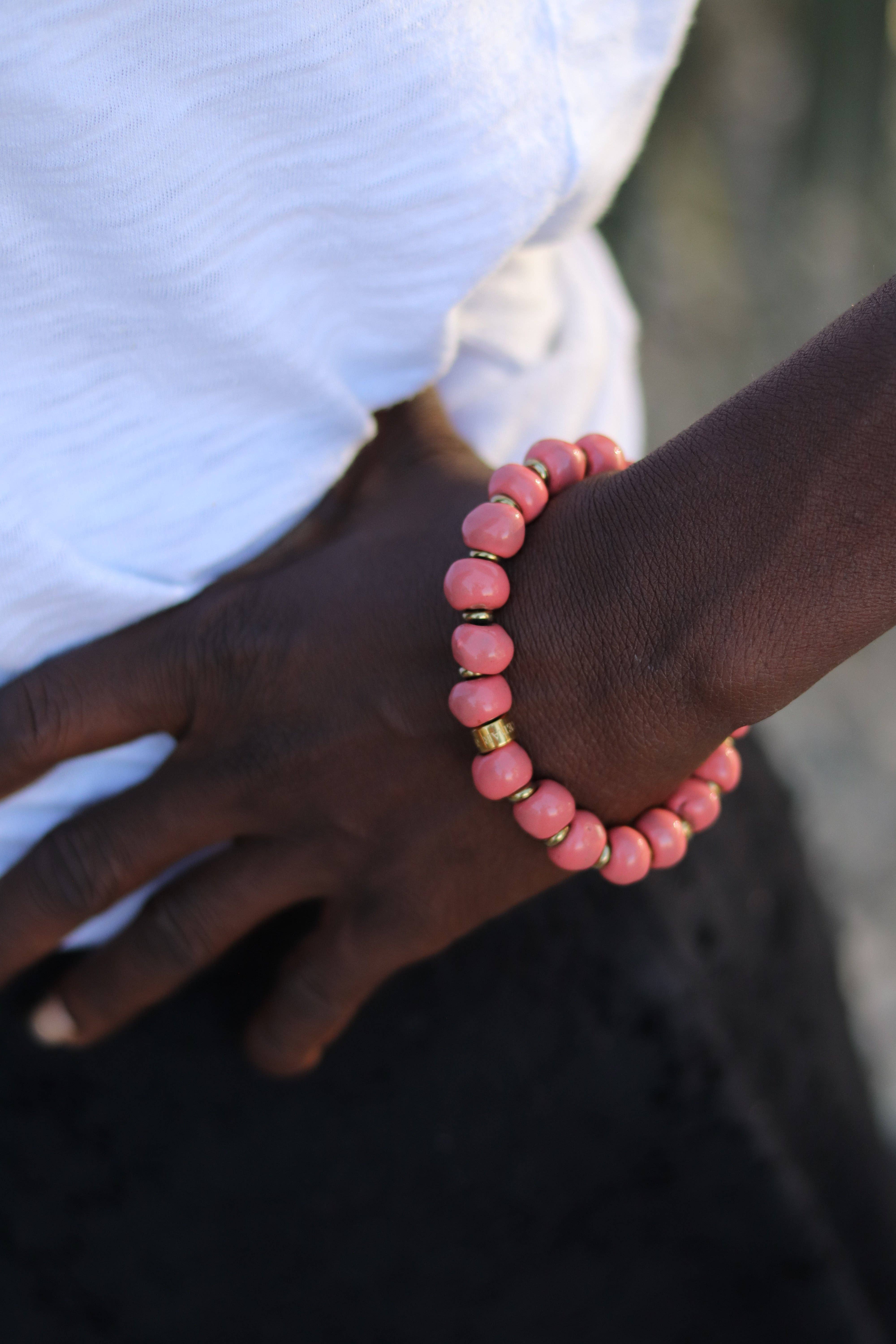 Vores Tap Tap-armbånd er opkaldt efter de sjove taxier i Haiti kaldet „Tap Tap"s“, vi elsker de sjove farver på disse unikke lerarmbånd lavet af vores partnere i Haiti. De stabler perfekt med så mange af vores andre armbånd. Få disse, før de sælger ud.