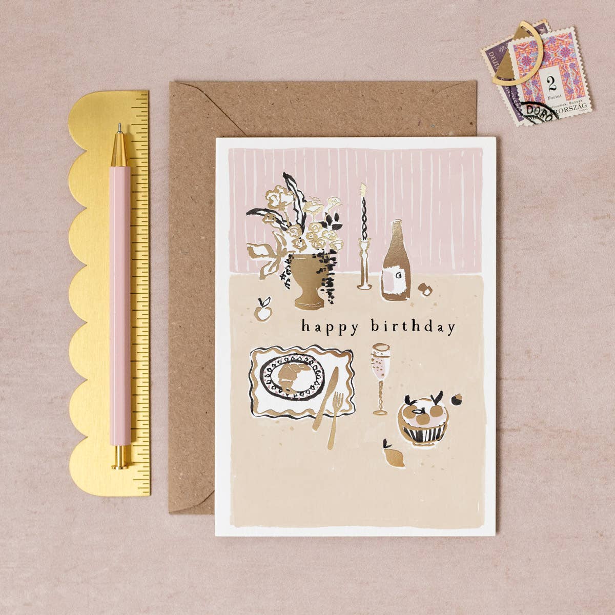 Dette fødselsdagskort fremkalder en beroligende, fredfyldt skønhed med sit håndmalede blomsterdesign, der skinner med detaljer af luksuriøs præget guldfolie. Indersiden af blomsterfødselsdagskortet er blank, hvilket giver plads til en personlig besked skrevet i hånden. Det kvindelige fødselsdagskort er perfekt som et venindefødselsdagskort, mor fødselsdagskort eller kæreste fødselsdagskort og leveres med en genanvendt kraftkonvolut. Blomsterfødselsdagskort Præget med guldfolie 100% genanvendt kraftkonvolut Blank indeni Luksus, 350gsm kort fra bæredygtige skove Illustreret i hånden i London Fremstillet i Storbritannien Kortstørrelse (BxH): 105 x 150mm / 4 x 6in Emballagemuligheder: Biologisk nedbrydelig, klar hylster eller emballagefri med konvolut indlejret i kortet. Skabt i Storbritannien ved hjælp af bæredygtigt indkøbt papir kan dette charmerende fødselsdagskort fra Sister Paper Co. sælges sammen med dine andre: Hilsningskort, Kvindelige Fødselsdagskort, Fødselsdagskort, Fødselsdagskort til Hende og Fødselsdagskort til Kvinder.