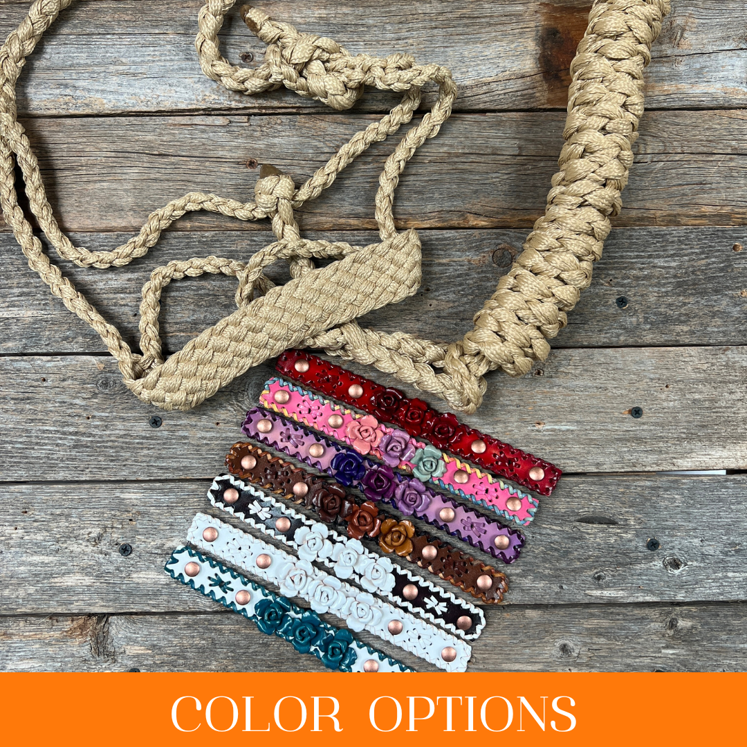 Lariat næsebånd med to 2,7 m matchende nylontøjler. Rebnæsebåndet har en samlet omkreds på 71 cm, og knuderne kan justeres op og ned. Kan nemt monteres på alle hovedtøj eller bidløse tøjler. Farver kan kombineres efter ønske. Alle tøjler er aftagelige.
