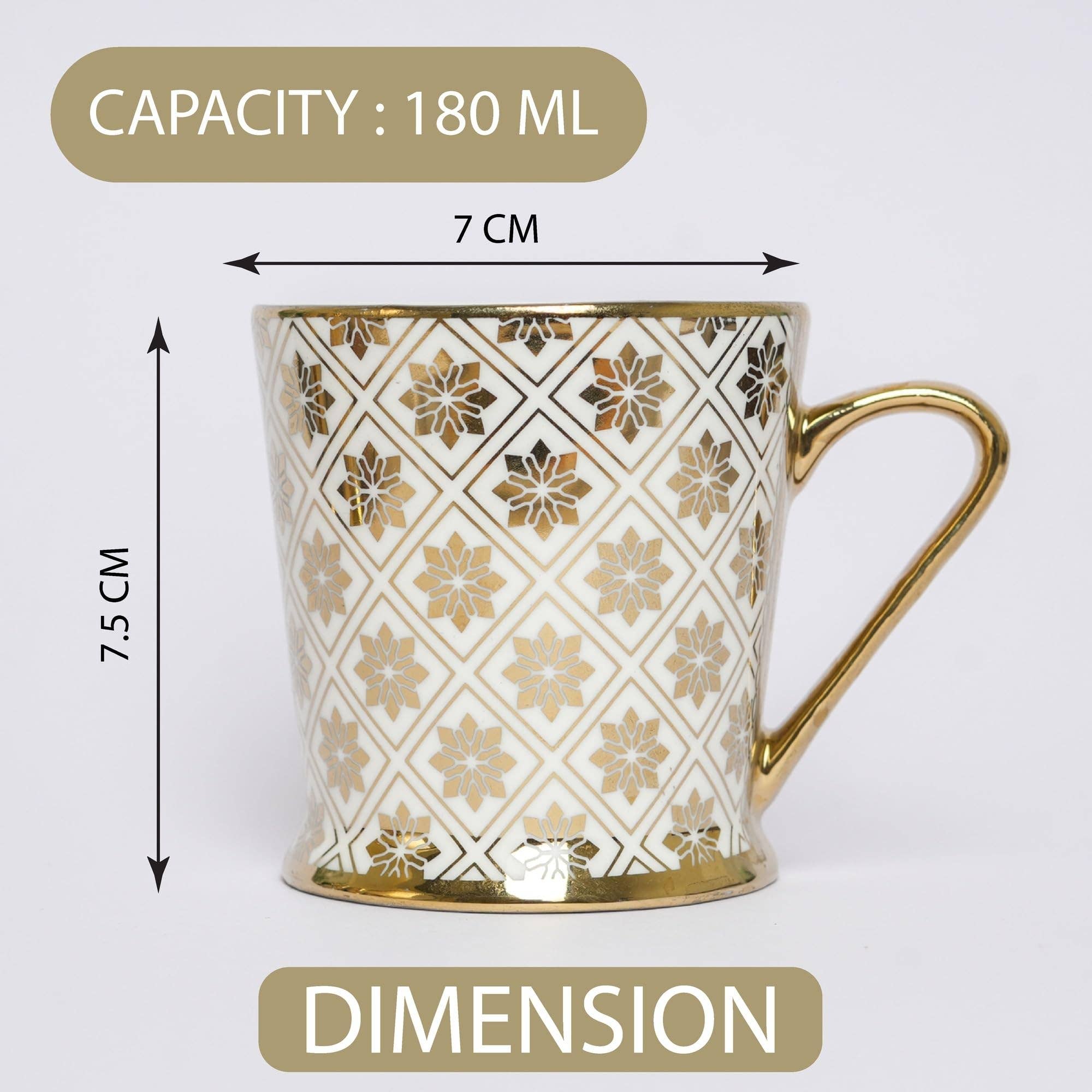 Forkæl dig selv med eksotisk elegance med Femora tyrkisk blomster mønster guld keramisk krus sæt. Denne 6-delte samling præsenterer 180 ML gyldne krus, hver med et fængslende tyrkisk-inspireret blomstermønster. Perfekt til at tilføje et strejf af unik luksus til dine drikkeoplevelser.