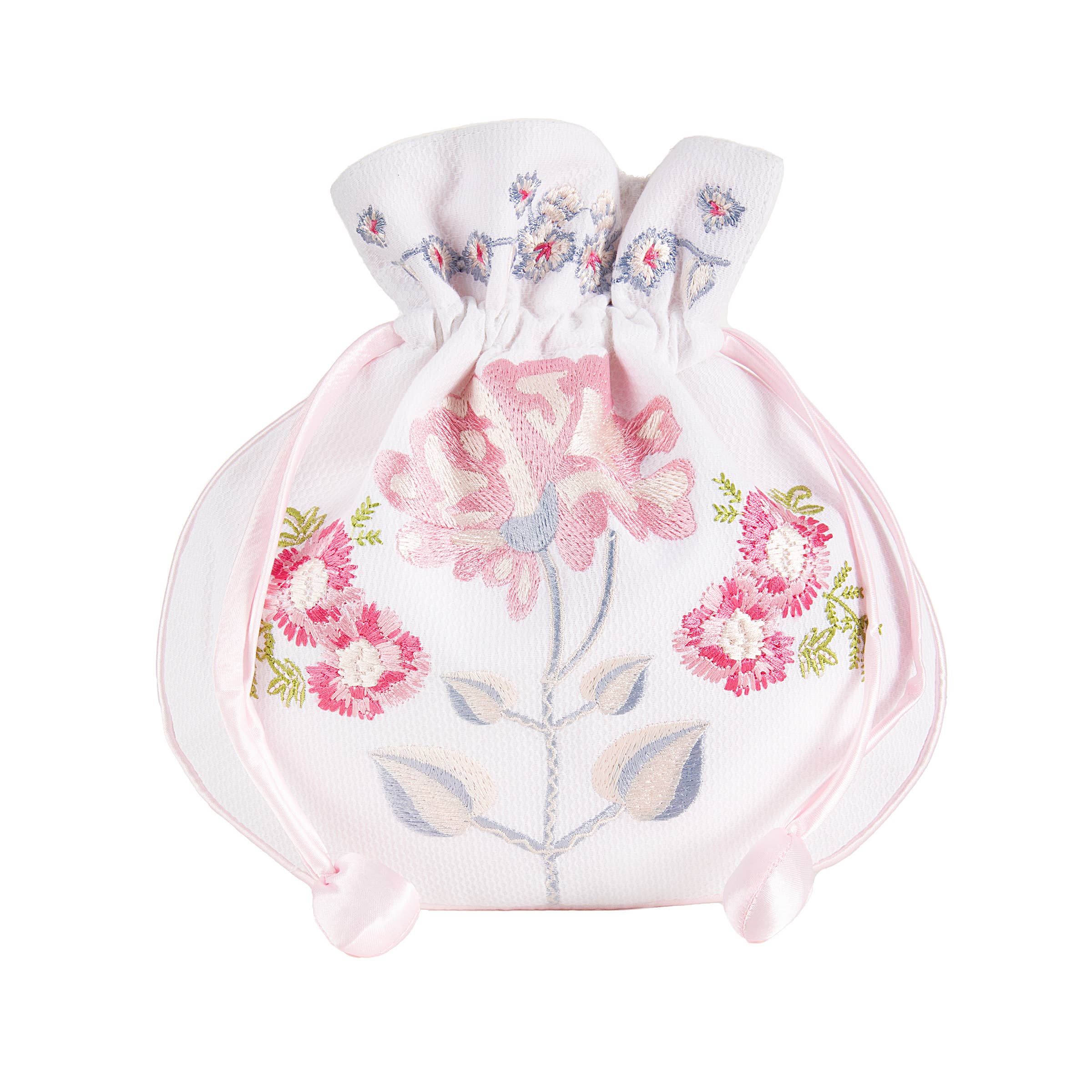 Vores Floral Bow Smykkepose er den perfekte kompliment til vores Floral Bow Smykkeskrin. Den broderede snorepose er foret med satin for omhyggeligt at holde styr på og beskytte dine mindste og mest værdifulde smykker, mens du rejser, uanset om du er på vej et par timer op ad vejen eller hele vejen over dammen. Funktioner: Snorelukning Satinfor Behandlet Piqué for pletmodstand Måler 7,25" x 9"