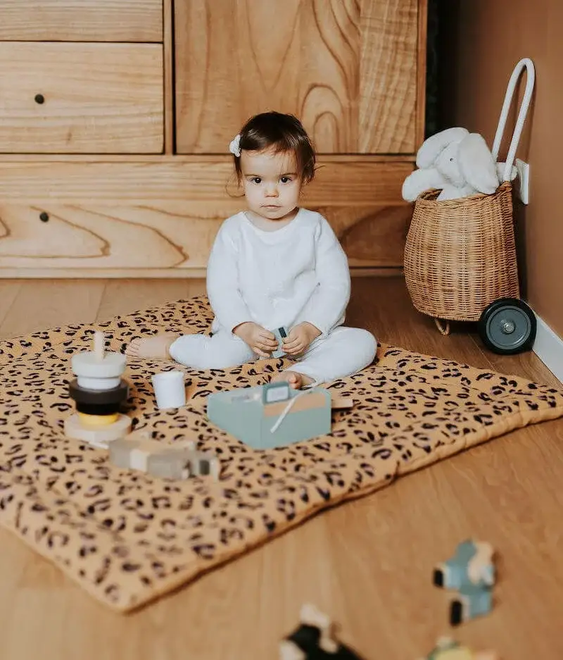 - Tæppet er fyldt med skum, hvilket sikrer behagelig varme. - Betrækket er syet i blød velour, let at rengøre. - Betrækket har lynlås, så det nemt kan vaskes ved større snavs. Legetæppet er lavet af blød velour, som er let at rengøre med en fugtig klud. Skumfyldet sikrer komfort og varme på alle overflader, også fliser. Tæppet har en skjult lynlås, så skumfyldet kan tages ud, og betrækket kan vaskes efter behov. Det skaber et sikkert og stort legeområde for barnet både til leg og hvile. Den enfarvede model giver små børn rolige omgivelser, og ældre børn kan nemt lægge puslespil på det. Babyly's Baby Gym stativ passer godt til tæppet. Vores tæpper har desuden en særlig lås, så de kan foldes og opbevares bekvemt efter brug. MATERIALER: 100% polyester med OekoTex®Standard100-certifikat FYLD: 2 cm skum