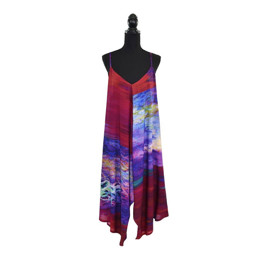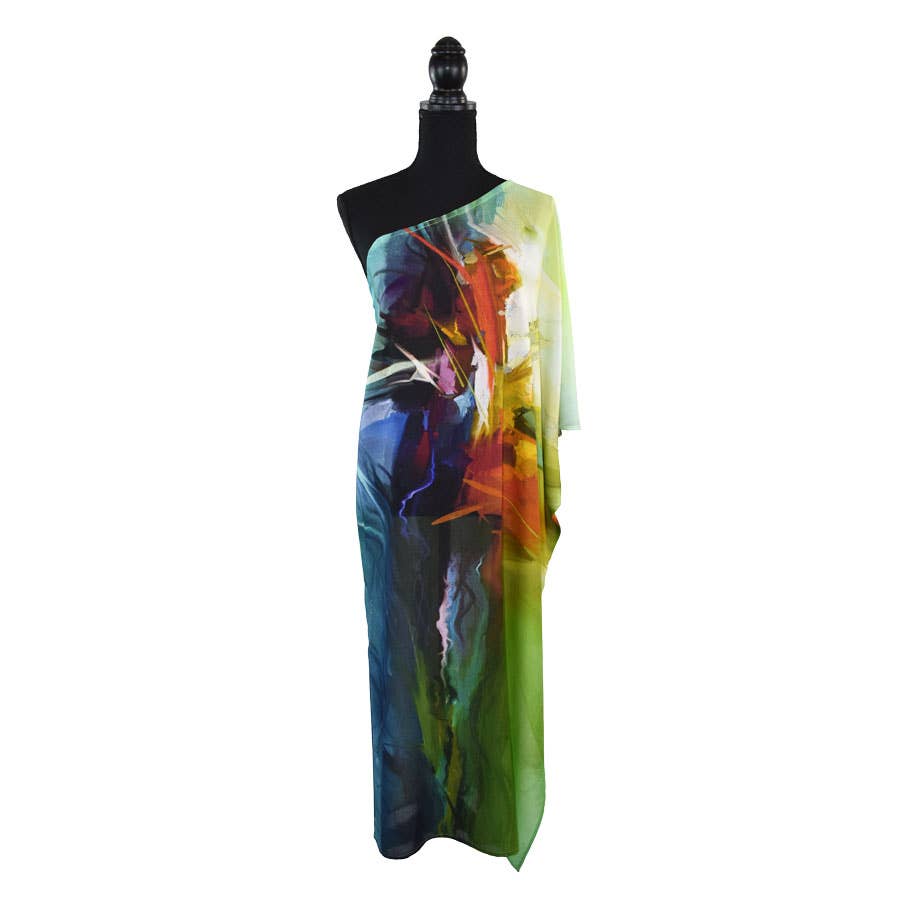 Denne dristige og farverige abstrakte maxikjole med ét skulderparti vil helt sikkert vække opmærksomhed. Kjolen er digitalt trykt på blød viscose med silkelignende finish og har to slidser i siderne, hvilket giver den et afslappet, men sexet udtryk. En skjult, valgfri skulderrem sikrer bedre pasform og støtte under brug. Med sit universelle snit kan kjolen bæres på både venstre eller højre skulder, og det vendbare print giver mulighed for flere forskellige looks. Pak denne iøjnefaldende slipkjole til din næste ferie eller sommerfest!