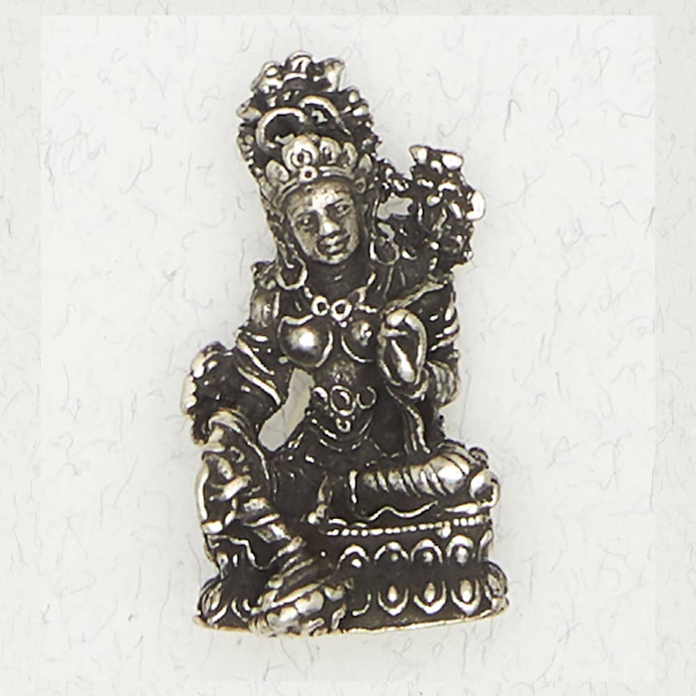 VEDA - Den Vediske Samling - LAKSHMI Lakshmi er den hinduistiske gudinde for rigdom og skønhed. Hun er konsort af Vishnu, bevareren af universet. Hun ses stående på en Lotus, som symboliserer renhed, samt holder to Lotuses i to af hendes fire hænder. En af de andre hænder hæves i gestus af at fjerne frygt, mens den resterende hånd er i gestus om at skænke gaver. Hendes påkaldelse er Om Nameh Lakshmi Namah. Vedhæng kommer på Legend Cards med en 33 tommer lang sort ledning. Fin blyfri tin. Pakket på genbrugspapirkort.
